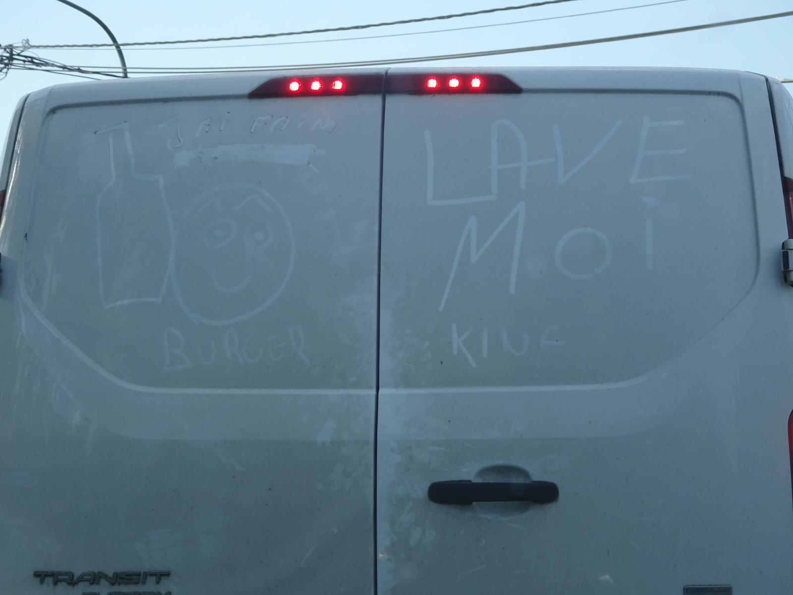 ![]() It's the traditional "Clean me" but also "I'm hungry" and "Burger King". UTC Time: 16:50, Tuesday 13 June 2023 Local Time: 18:50, Tuesday 13 June 2023 Estimate of longitude: 3° 36' 15.05" E = 3.604180° Estimate of latitude: 50° 32' 47.80" N = 50.546610° Possible error on position estimate: 5 metres | |