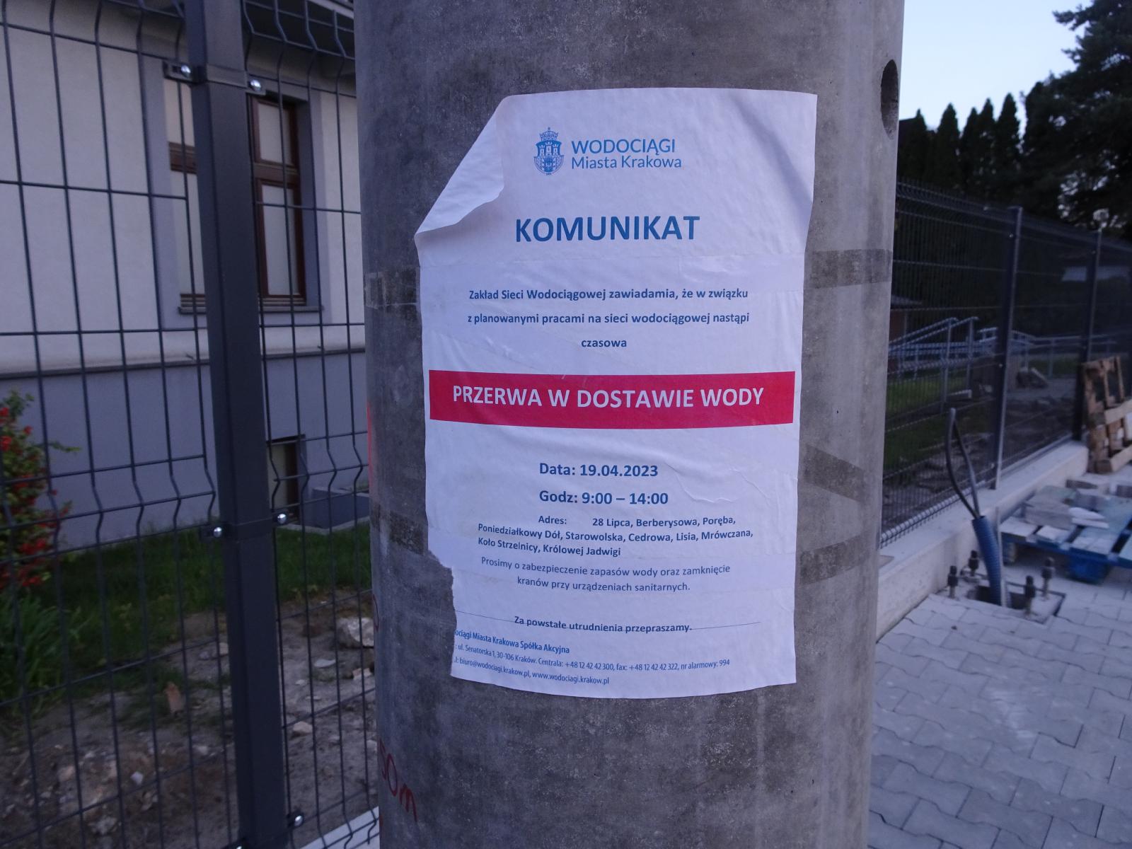![]() This notice about a temporary disruption to the water supply does have the name of the street written on it. I thought perhaps I might have to use that instead of a proper sign. UTC Time: 17:56, Thursday 04 May 2023 Local Time: 19:56, Thursday 04 May 2023 Estimate of longitude: 19° 52' 35.00" E = 19.876390° Estimate of latitude: 50° 3' 55.40" N = 50.065390° Possible error on position estimate: 5 metres | |