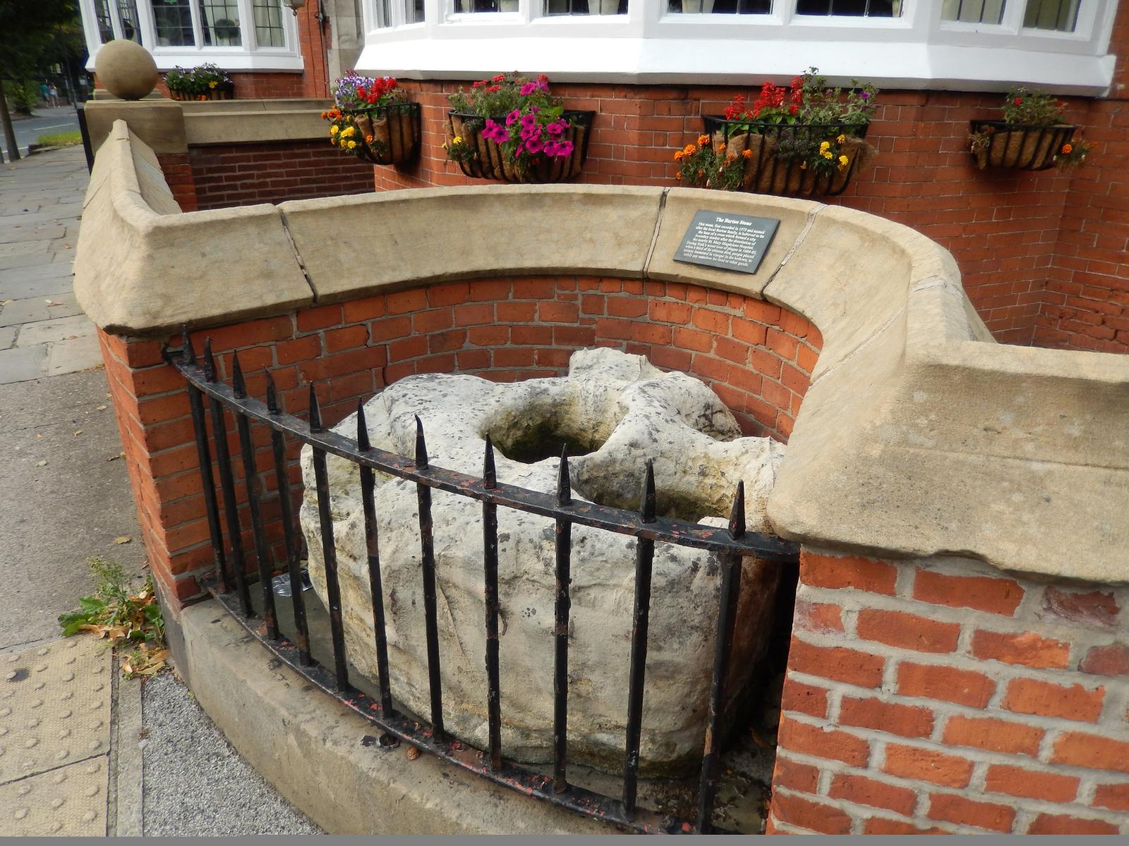 ![]() According to a sign this is the Burton Stone. It is thought to be the base of an old cross and when York was infected with the plague in 1604-1605, citizens buying things from outside traders would put their money into pools of vinegar in the hollows, to sanitise it. UTC Time: 16:12, Sunday 23 August 2015 Local Time: 17:12, Sunday 23 August 2015 Estimate of longitude: 1° 5' 35.16" W = -1.093100° Estimate of latitude: 53° 58' 1.56" N = 53.967100° Possible error on position estimate: 100 metres | |