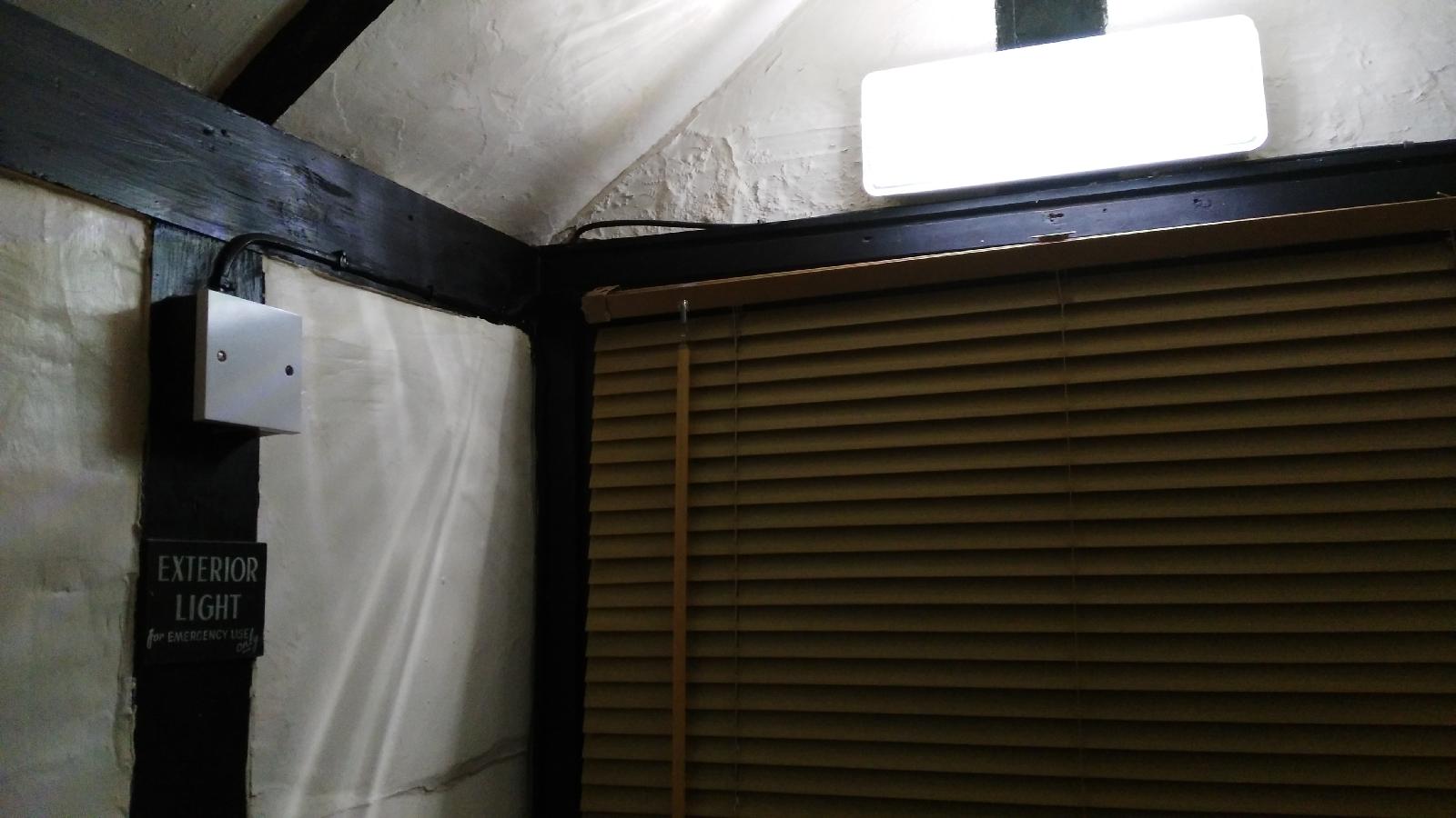 ![]() The light above the window, which appears washed out in this picture, is nearly as bright as a normal room light but can't be turned off and is a sign saying that the window is the emergency exit. I'm not really sure what is meant by the sign on the wall which says "EXTERIOR LIGHT for EMERGENCY USE only". UTC Time: 19:16, Wednesday 02 September 2015 Local Time: 20:16, Wednesday 02 September 2015 Estimate of longitude: 0° 43' 55.60" E = 0.732110° Estimate of latitude: 50° 57' 1.08" N = 50.950300° Possible error on position estimate: 100 metres | |