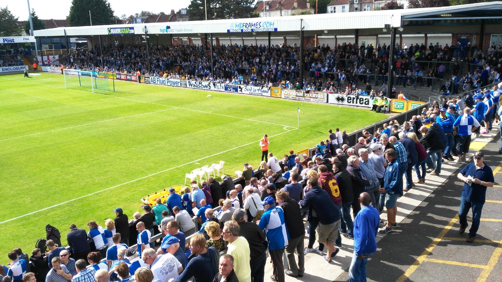 ![]() I failed to touch this ground on Wednesday but it only took a small diversion to come back for another go. Bristol Rovers are now back in the fourth division, having temporarily dropped to the fifth last year. I sense that they don't have have high expectations of reaching the higher divisions, where all-seater stadia are compulsory. This ground has a capacity of 12100, of which only about 3000 are seated. The record attendance was 12011. ![]() UTC Time: 13:48, Saturday 12 September 2015 Local Time: 14:48, Saturday 12 September 2015 Estimate of longitude: 2° 34' 58.55" W = -2.582930° Estimate of latitude: 51° 29' 12.19" N = 51.486720° Possible error on position estimate: 100 metres | |