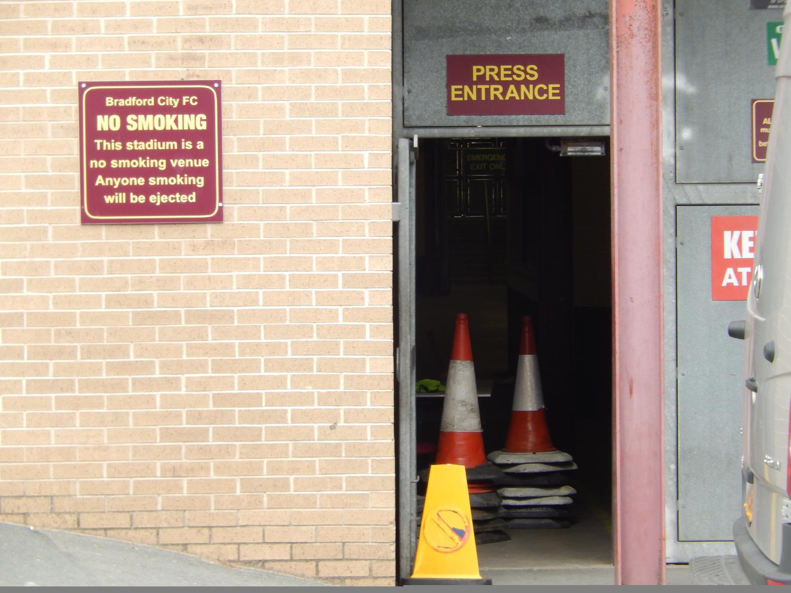 ![]() I haven't seen another ground which has so many or such forceful warnings about smoking but then Valley Parade was the scene of a fire which killed 56 spectators during the last game of the season in 1985. You'll be pleased to know that there won't be any more scenes of stadium disasters coming up. There have only been the three serious incidents in England. UTC Time: 11:23, Monday 17 August 2015 Local Time: 12:23, Monday 17 August 2015 Estimate of longitude: 1° 45' 35.39" W = -1.759830° Estimate of latitude: 53° 48' 13.75" N = 53.803820° Possible error on position estimate: 50 metres | |