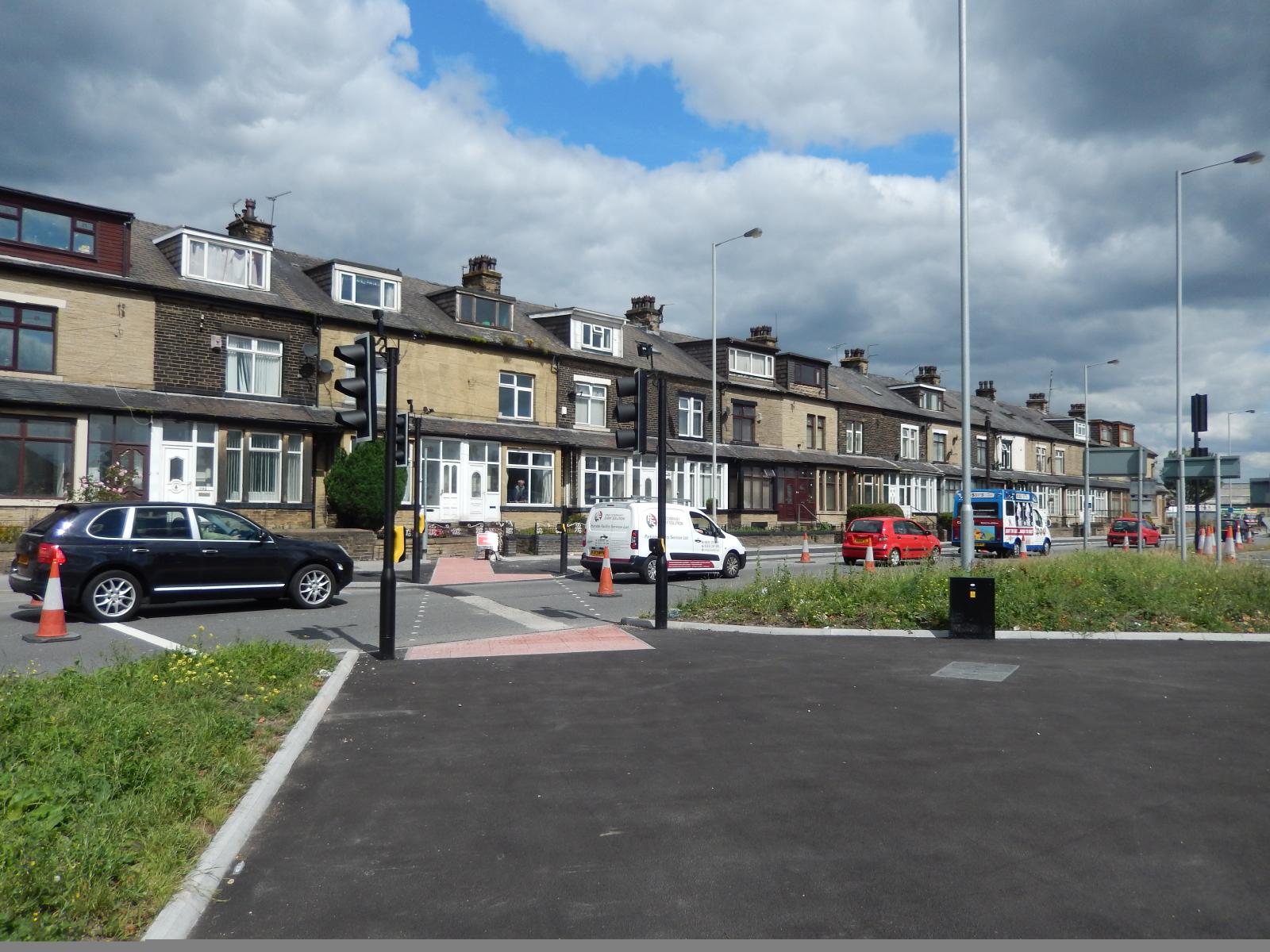 ![]() For a while when I was thinking of making this a tour of every British city, I considered starting and ending here. I didn't realise that my planned route for the football tour would be coming through here too so it was a surprise when I recognised the place. What's interesting about it is that Leeds and Bradford are one of only three pairs of cities in Britain which touch each other. The border runs very close to the line of this pedestrian crossing although the crossing wasn't here when I was planning that trip so I can't be any more precise. The border is certainly at an angle to the houses so at least one of them, possibly the one with the man watching me out of the window, is partly in one city and partly in another. As I rode off, I wondered if his house and the Royal Courts of Justice are the only such properties in Britain. UTC Time: 12:06, Monday 17 August 2015 Local Time: 13:06, Monday 17 August 2015 Estimate of longitude: 1° 42' 13.72" W = -1.703810° Estimate of latitude: 53° 48' 6.84" N = 53.801900° Possible error on position estimate: 100 metres | |