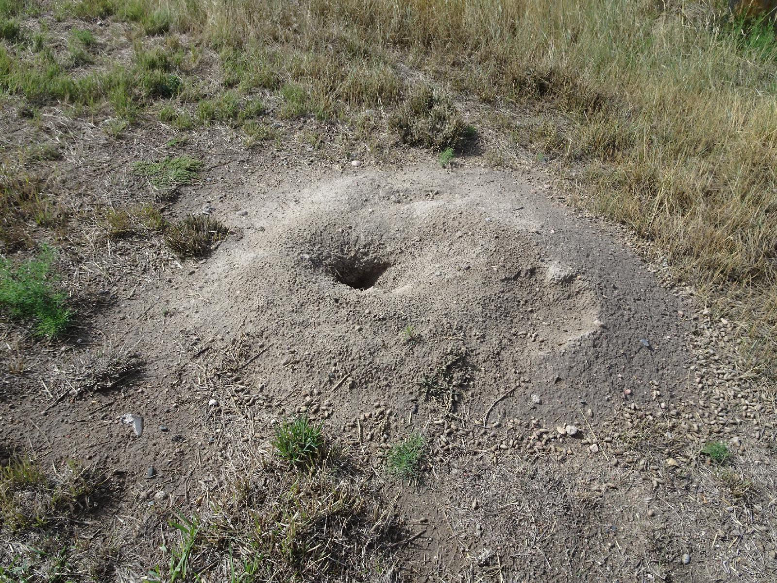 ![]() Prairie dog burrows. I just saw one scamper across the ground and disappear down one of these. UTC Time: 16:07, Wednesday 16 August 2017 Local Time: 10:07, Wednesday 16 August 2017 Estimate of longitude: 103° 41' 40.74" W = -103.694650° Estimate of latitude: 41° 52' 57.18" N = 41.882550° Possible error on position estimate: 5 metres | |