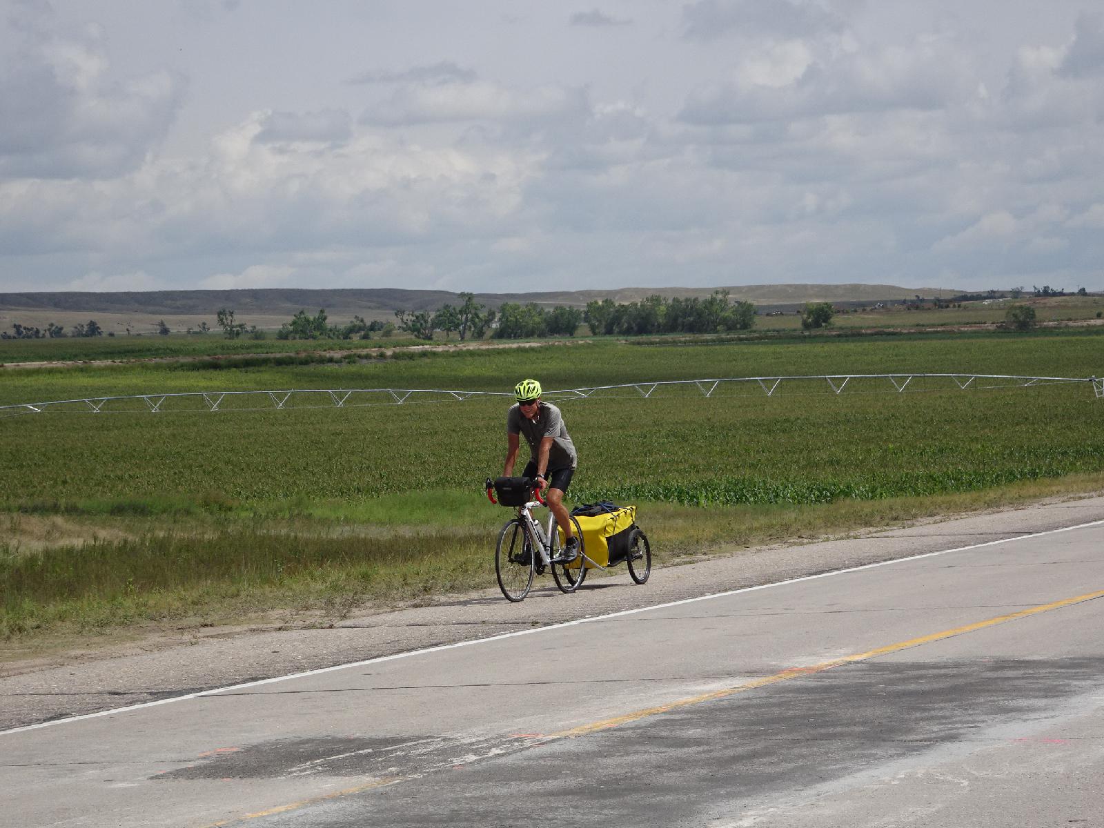 ![]() This is Tom from Texas. He's 68. He has spent the majority of the last six years cycling. Each year, he does a big circular tour where he heads North in the Spring and returns home in the Autumn. His bike looks like a top-end machine but he said he got it for $130 from a Wal-Mart in Louisiana after his previous bike got cut into bits during the night by a tornado. He is also getting annoyed by the cracks in the shoulders on this road but he said that the road which I will be using for the next three days is lovely and smooth with pleasant meditative scenery. UTC Time: 18:10, Wednesday 16 August 2017 Local Time: 12:10, Wednesday 16 August 2017 Estimate of longitude: 103° 15' 53.71" W = -103.264920° Estimate of latitude: 41° 48' 54.94" N = 41.815260° Possible error on position estimate: 5 metres | |
