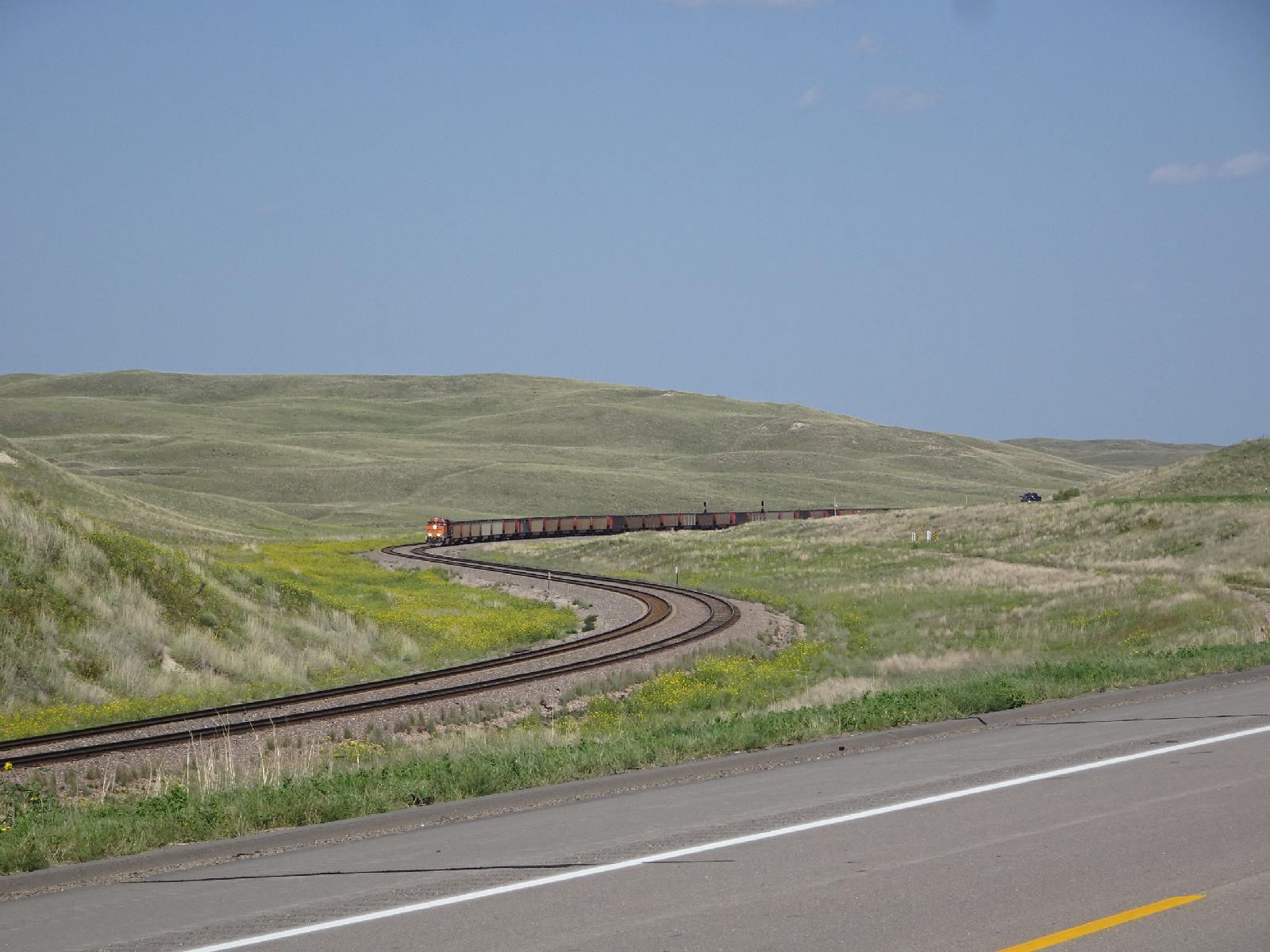 ![]() Here's an empty train heading back up to the Wyoming mines. I have heard that something like 70 to 80 trains of coal per day are produced by those mines. That must be at least 10000 wagons. UTC Time: 21:13, Thursday 17 August 2017 Local Time: 15:13, Thursday 17 August 2017 Estimate of longitude: 101° 11' 19.72" W = -101.188810° Estimate of latitude: 42° 2' 18.49" N = 42.038470° Possible error on position estimate: 5 metres | |