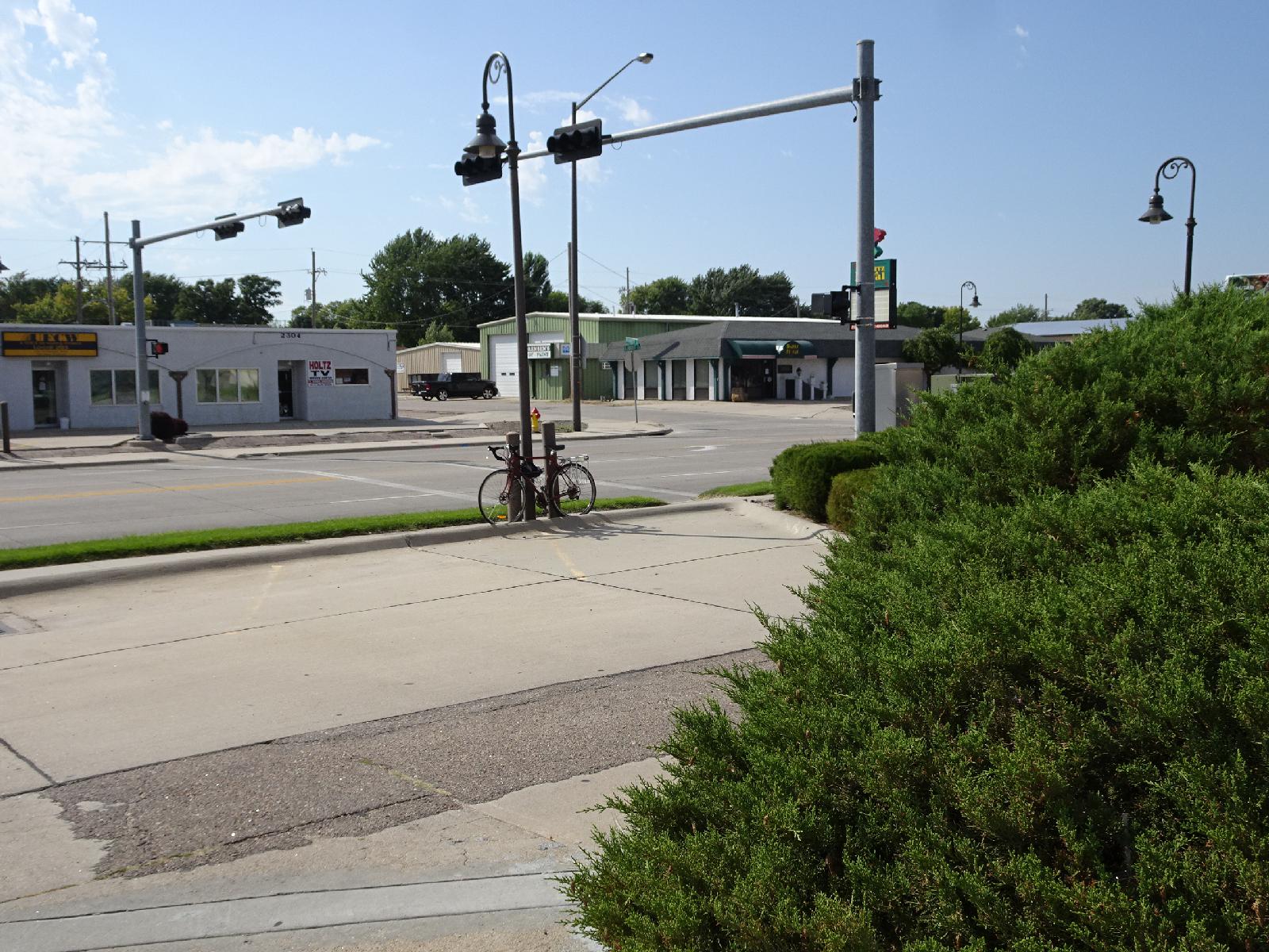 ![]() Another man was parking a bike here at the same time as I was. He hid his in the bush. I don't know whether that was to stop it being stolen or to protect it from the Sun. I would later move mine to another pole nearer to my room and then, after seeing tonight's weather forecast, into my room. UTC Time: 21:47, Saturday 19 August 2017 Local Time: 16:47, Saturday 19 August 2017 Estimate of longitude: 98° 20' 22.09" W = -98.339470° Estimate of latitude: 40° 53' 56.11" N = 40.898920° Possible error on position estimate: 5 metres | |