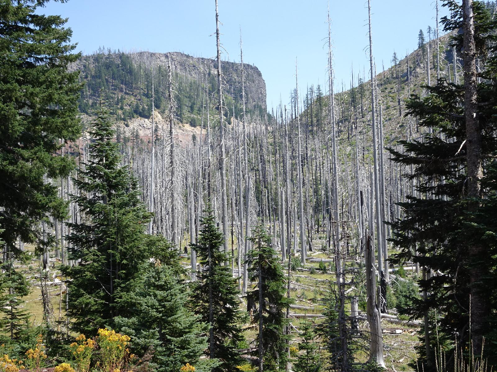 ![]() Here are a load of trees which got burned but stayed standing. The summit of today's route is at the base of the vertical cliff. UTC Time: 21:49, Monday 31 July 2017 Local Time: 14:49, Monday 31 July 2017 Estimate of longitude: 121° 53' 44.09" W = -121.895580° Estimate of latitude: 44° 25' 45.41" N = 44.429280° Possible error on position estimate: 10000 metres | |