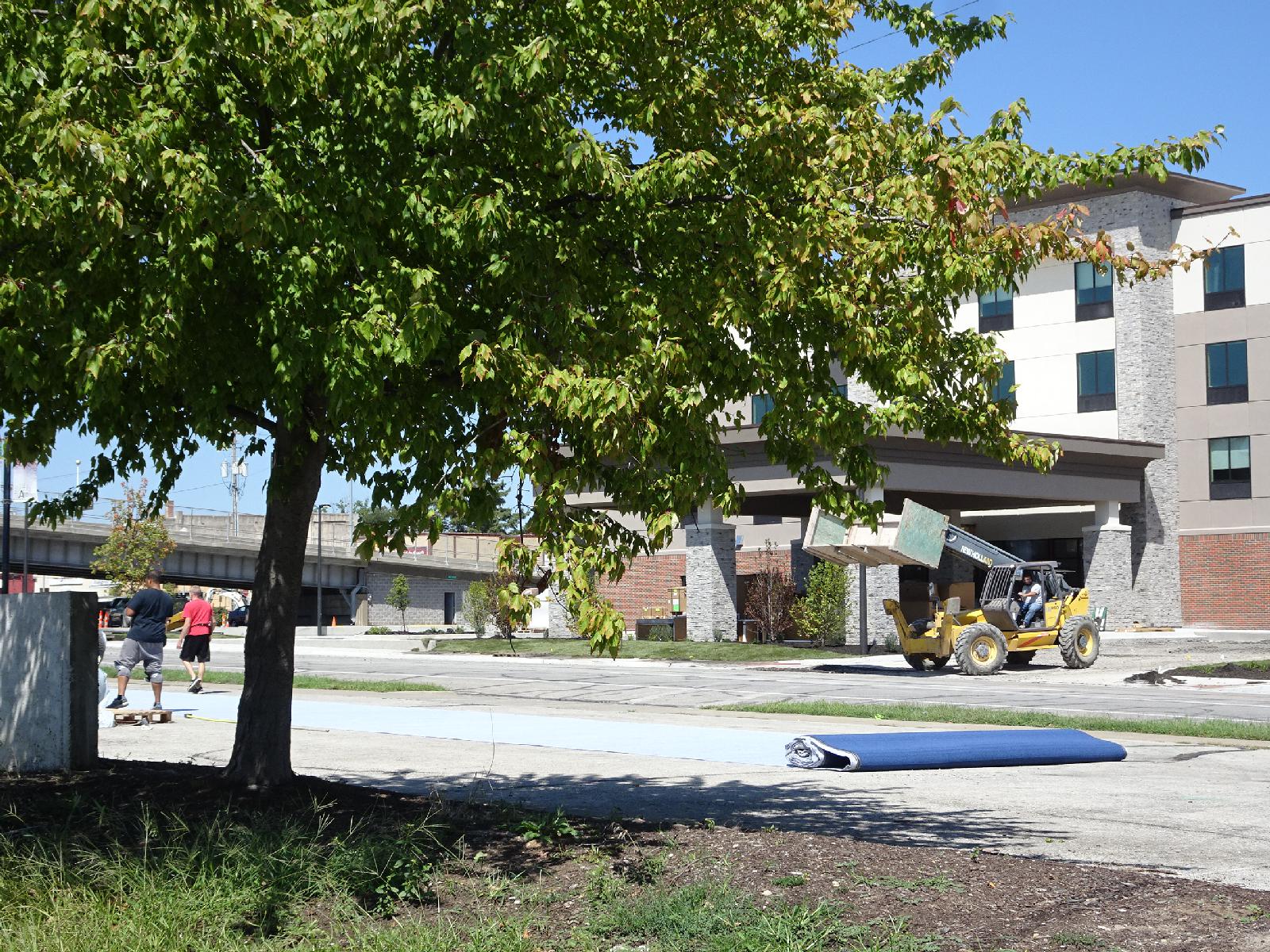 ![]() These two people are measuring out carpet for the hotel in the car park across the street. UTC Time: 17:09, Wednesday 23 August 2017 Local Time: 12:09, Wednesday 23 August 2017 Estimate of longitude: 95° 7' 4.48" W = -95.117910° Estimate of latitude: 39° 33' 37.80" N = 39.560500° Possible error on position estimate: 10 metres | |