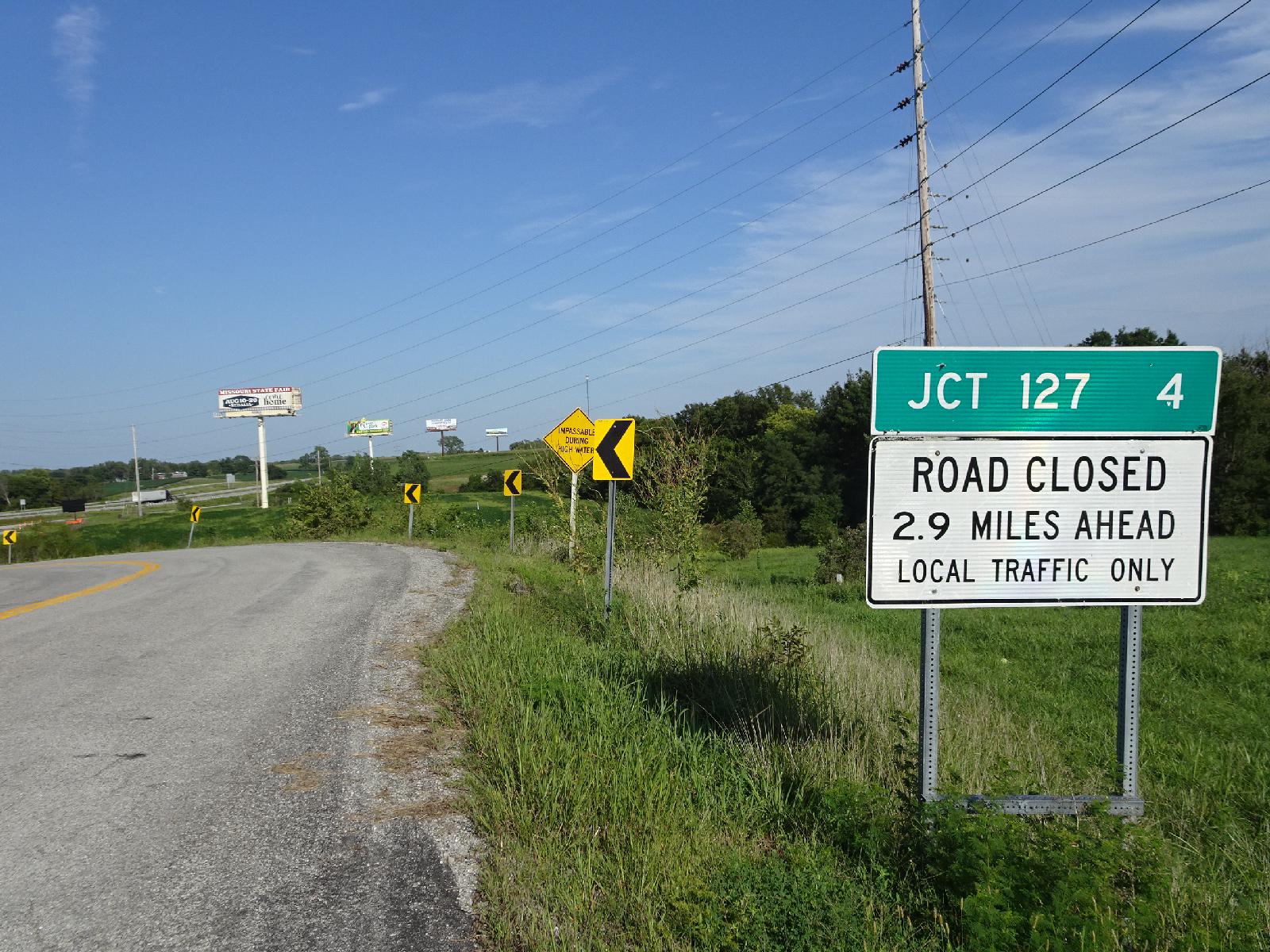 ![]() I'm only four miles away from tonight's hotel but it looks like there might be a problem with the road. The diamond-shaped sign says "IMPASSABLE DURING HIGH WATER". The sign in the foreground looks a bit too permanent to be for a flood though. If the problem is 2.9 miles away, then it's around the place where we have to cross a small river called Davis Creek. The road along the left side of the Interstate doesn't cross the river so I can't use that. I could go for a couple of miles on this road and they deviate onto gravel roads to the right but I would have to walk them because I don't want another puncture, and if this road is flooded then those roads probably will be too. There are also some gravel roads to the left of the Interstate but if I went that way, I would be on gravel for many miles and they might be flooded as well. My only option might be to actually ride on the shoulder of the Interstate. UTC Time: 22:27, Friday 25 August 2017 Local Time: 17:27, Friday 25 August 2017 Estimate of longitude: 93° 29' 38.80" W = -93.494110° Estimate of latitude: 38° 58' 59.66" N = 38.983240° Possible error on position estimate: 10 metres | |