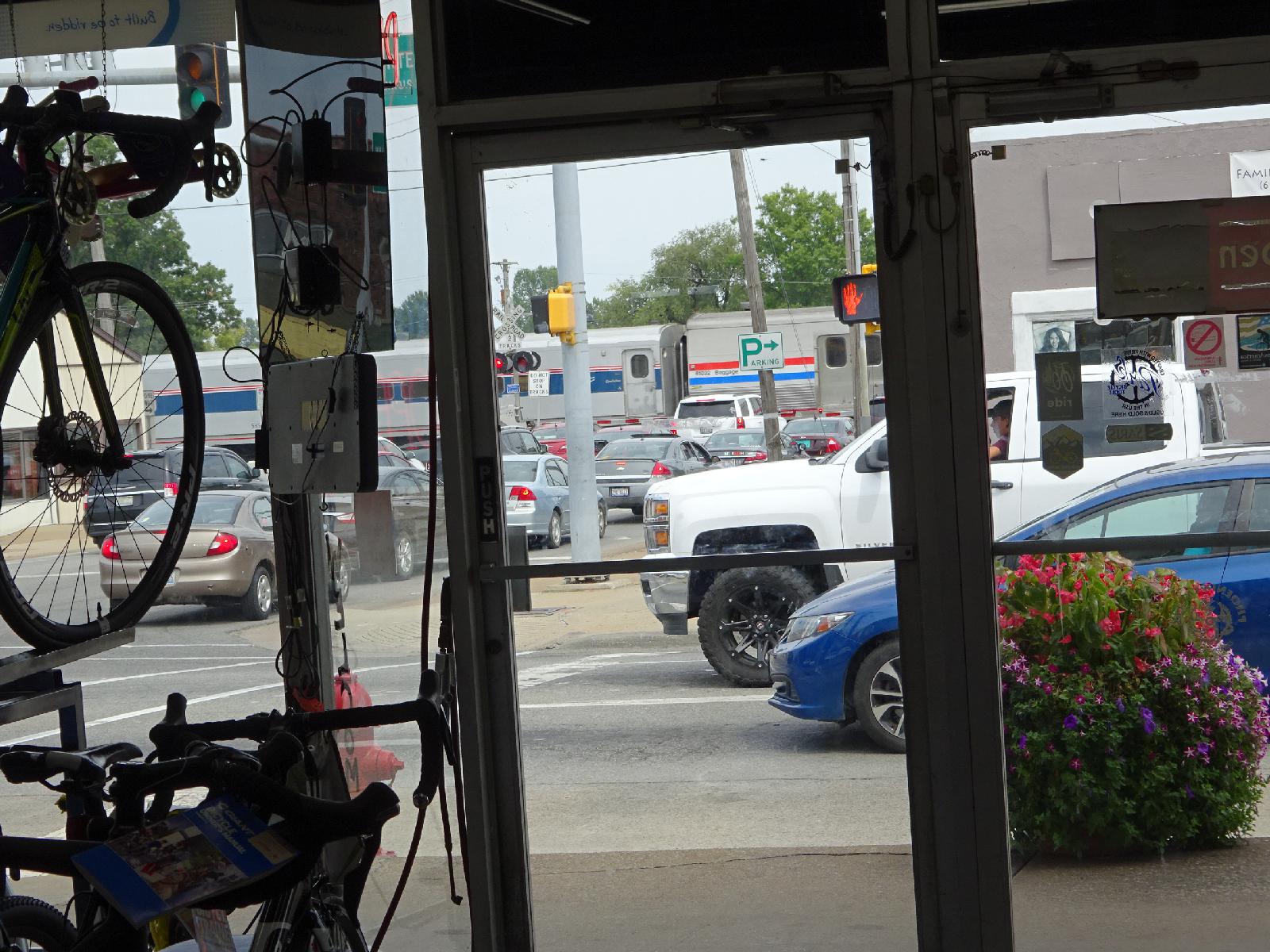 ![]() I'm waiting in the bike shop now while the bike has its tyres changed and I've just seen a train coming across the level crossing outside. I think it's the first passenger train I've seen on this whole trip. The people in this shop were all marvelling at how fast my old back tyre had gone bald. The new tyres are Schwalbe Marathons. I like those. They are normally good. I started the trip with two of those but in a slightly wider size than the new ones. I'm also having new pads put on the back brake, to replace the existing ones which are severely worn and partly cracked. Strangely, when I test them afterwards, the new pads wouldn't actually be much better at stopping the bike than the old ones. For some reason, the people who serviced the bike put the saddle as high as it would go and then denied that they had done it. It was far too high to sit on. Then a man came in saying that he wanted his bike repaired but didn't have any money. The man who, I assume, owns this shop responded by going outside and doing the repairs on the pavement in front of the shop. I don't know if there's some legal reason why he couldn't do free repairs in here. UTC Time: 19:19, Wednesday 30 August 2017 Local Time: 14:19, Wednesday 30 August 2017 Estimate of longitude: 89° 12' 59.80" W = -89.216610° Estimate of latitude: 37° 43' 30.47" N = 37.725130° Possible error on position estimate: 50 metres | |