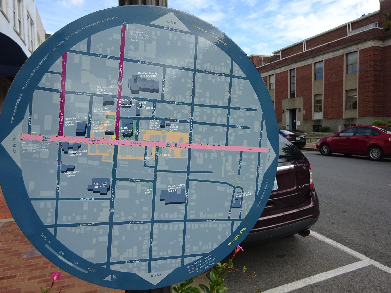 ![]() This map has the date of the eclipse at the top so it was probably installed to help eclipse tourists. It uses purple and pink, like the cars which I mentioned. I wonder if they are the town colours. UTC Time: 20:13, Thursday 31 August 2017 Local Time: 15:13, Thursday 31 August 2017 Estimate of longitude: 87° 29' 55.21" W = -87.498670° Estimate of latitude: 37° 19' 41.66" N = 37.328240° Possible error on position estimate: 10 metres | |