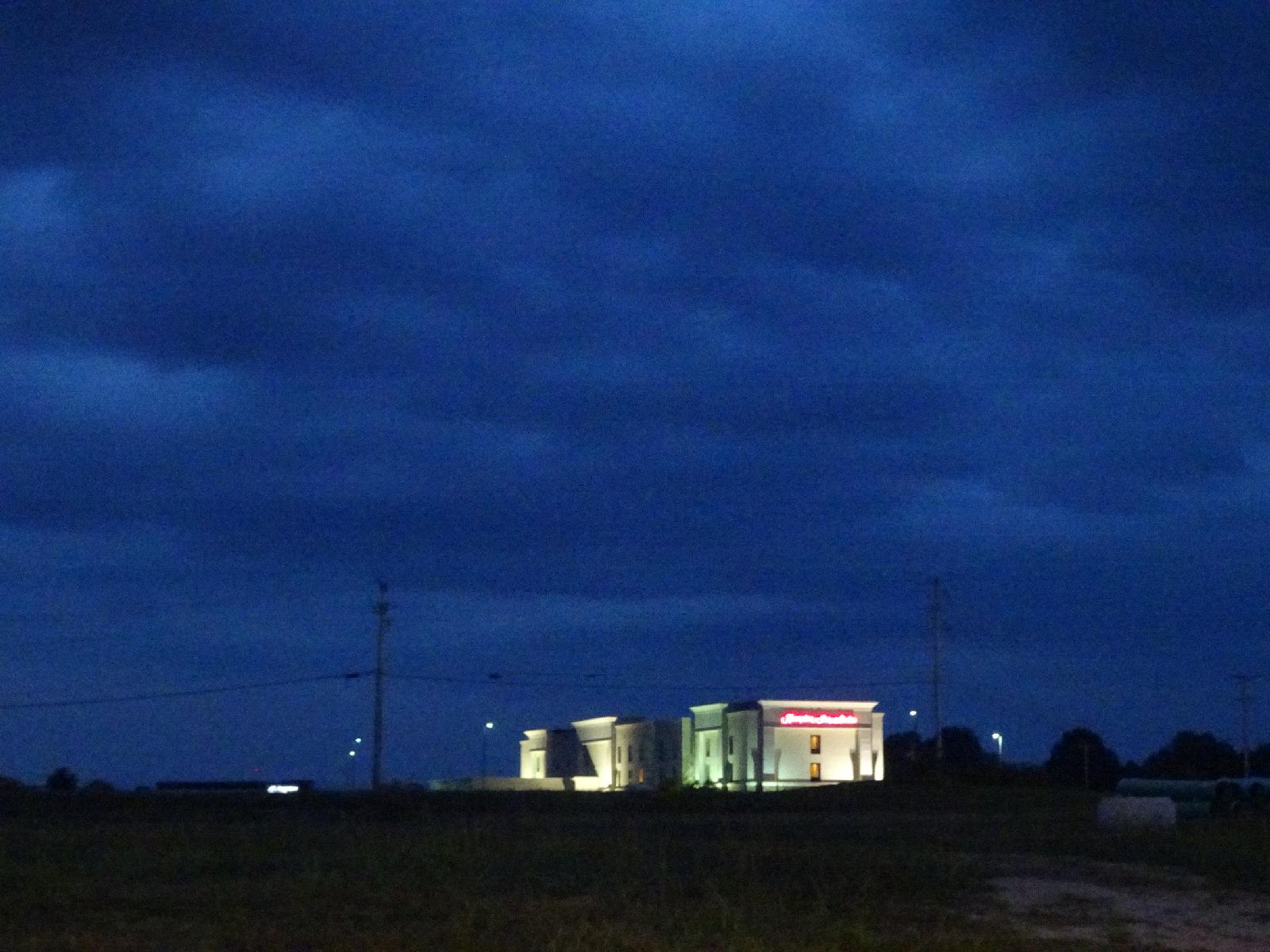 ![]() I checked the forecast this evening and it said that the heavy rain would be arriving at about eight o'clock this evening. It's not raining yet but some thick clouds have gathered. UTC Time: 00:39, Friday 01 September 2017 Local Time: 19:39, Thursday 31 August 2017 Estimate of longitude: 87° 28' 58.69" W = -87.482970° Estimate of latitude: 37° 19' 38.89" N = 37.327470° Possible error on position estimate: 1000 metres | |