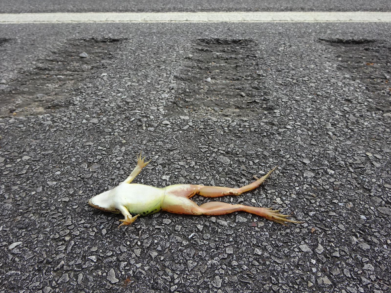 ![]() A well-preserved dead frog next to the annoying runble strips which have been a feature of many roads in Kentucky and Tennessee. UTC Time: 14:02, Wednesday 06 September 2017 Local Time: 09:02, Wednesday 06 September 2017 Estimate of longitude: 85° 6' 55.22" W = -85.115340° Estimate of latitude: 35° 59' 52.84" N = 35.998010° Possible error on position estimate: 20 metres | |