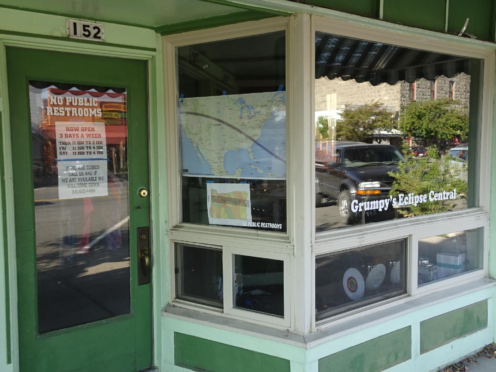 ![]() This looks like a dedicated eclipse shop. Prairie City seems to be more obsessed with the eclipse than anywhere I've been so far. Apparently, my hotel here has been fully booked for the eclipse dates for three years now. UTC Time: 00:17, Thursday 03 August 2017 Local Time: 17:17, Wednesday 02 August 2017 Estimate of longitude: 118° 42' 37.44" W = -118.710400° Estimate of latitude: 44° 27' 46.04" N = 44.462790° Possible error on position estimate: 10 metres | |