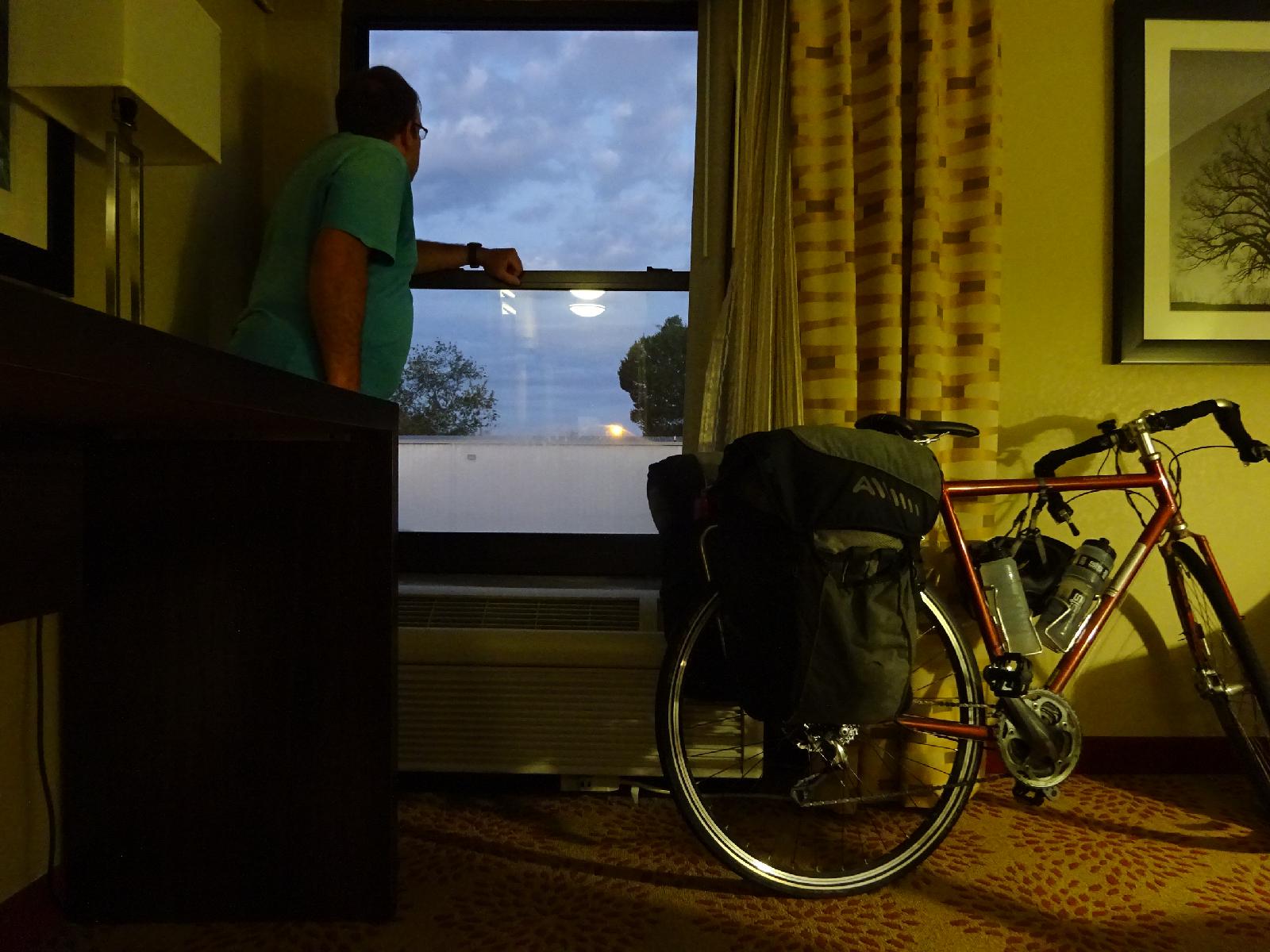 ![]() I'm all ready to go. In a few minutes, it will be light enough for me to set off. I think I'm going to get through this whole trip without needing to use lights. I did attach them to my bike at the top of the Teton Pass in Wyoming but since I then descended into Jackson using the cycle path rather than the main road, I didn't turn them on. UTC Time: 10:55, Wednesday 13 September 2017 Local Time: 06:55, Wednesday 13 September 2017 Estimate of longitude: 82° 9' 31.28" W = -82.158690° Estimate of latitude: 34° 13' 1.70" N = 34.217140° Possible error on position estimate: 200 metres | |