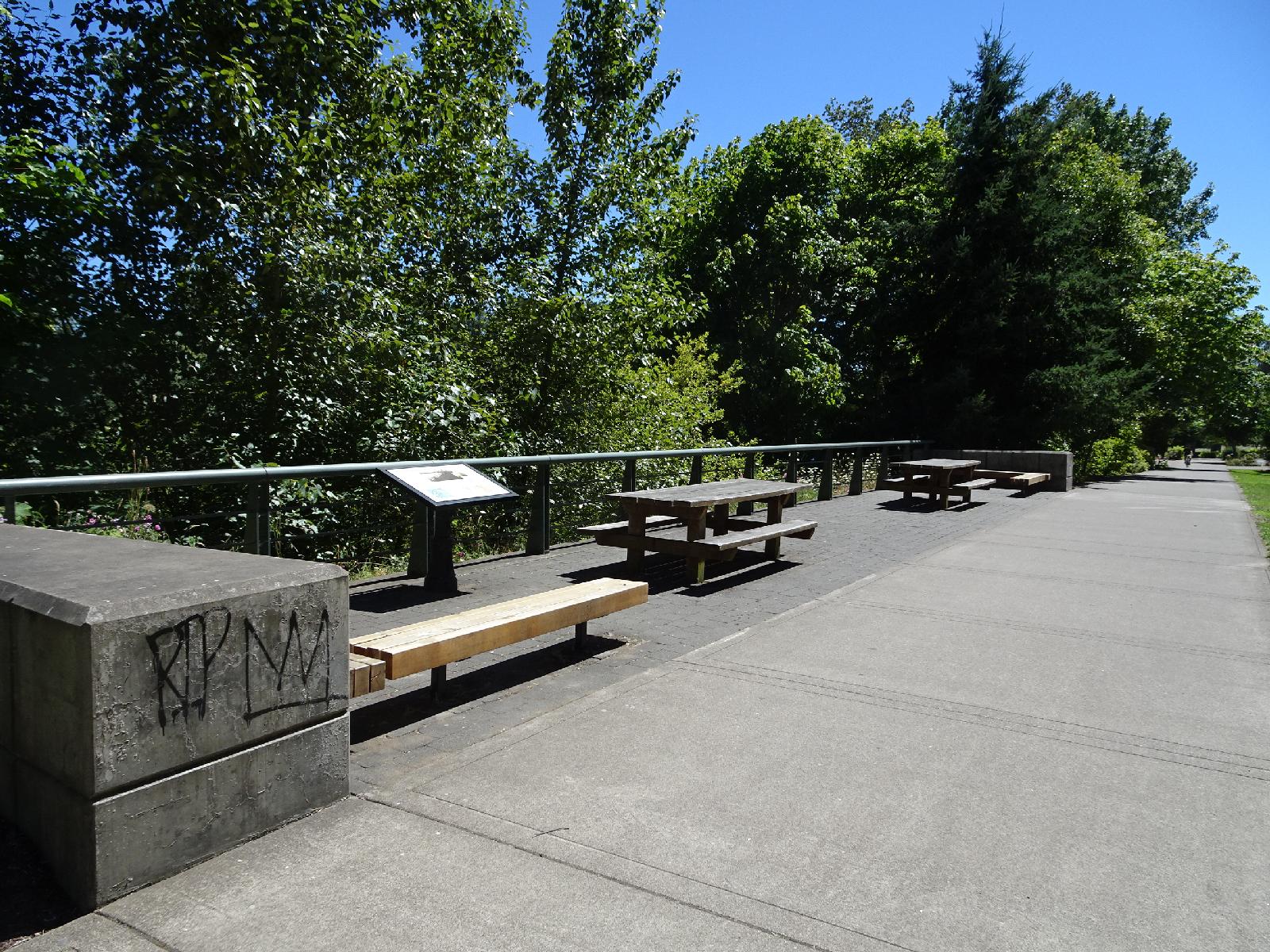![]() The last section of today's route, along the bank of the Willamette River to my hotel. I don't need to stop here but my attention was caught by the information board which explains that in the 1880s, the river looked like it was going to cut itself a new channel and abandon the town. The solution was to cut another new channel for it to make it bypass the place where it had been doing its own cutting. UTC Time: 21:34, Saturday 29 July 2017 Local Time: 14:34, Saturday 29 July 2017 Estimate of longitude: 123° 15' 39.24" W = -123.260900° Estimate of latitude: 44° 33' 34.78" N = 44.559660° Possible error on position estimate: 100 metres | |