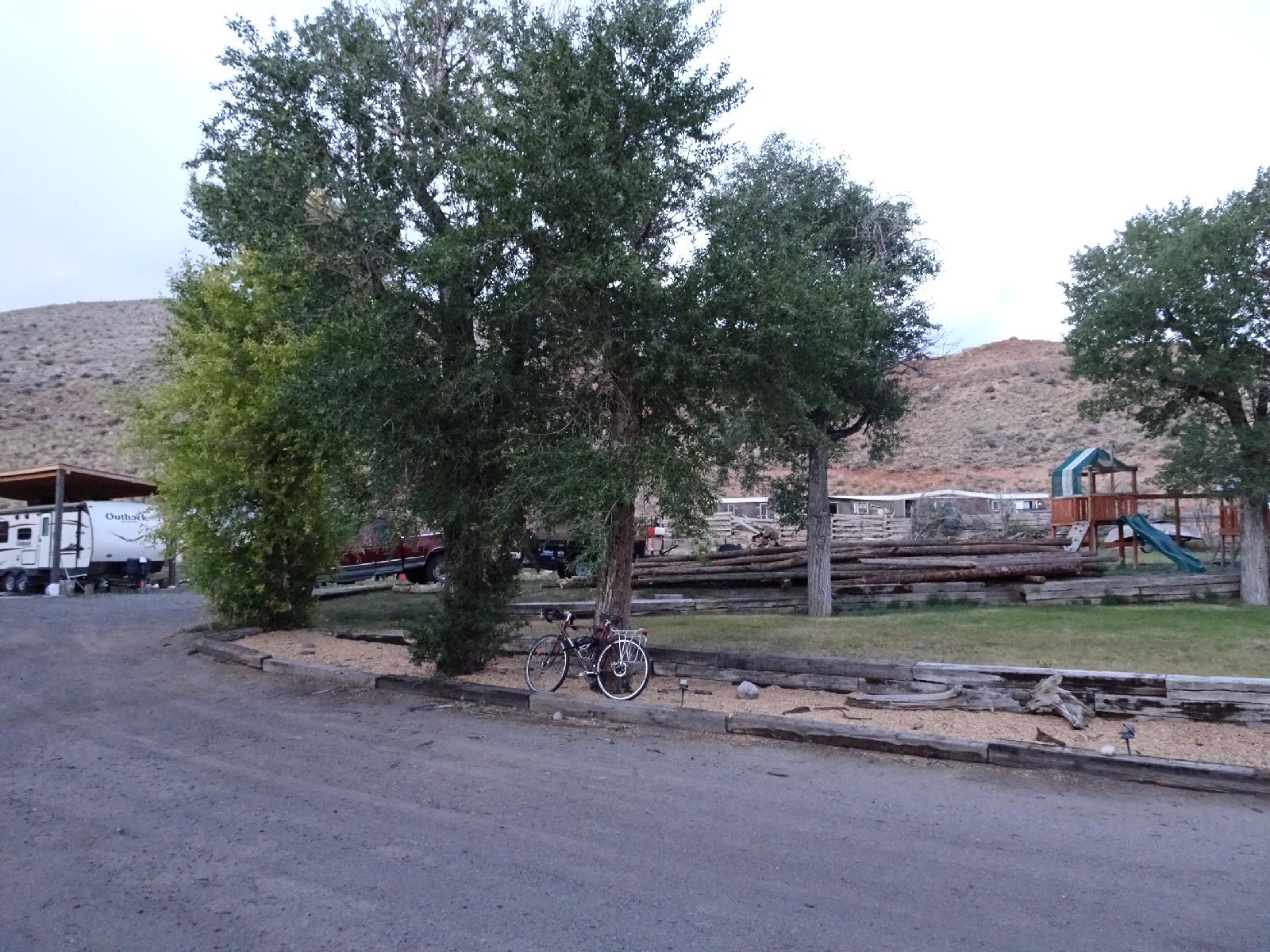 ![]() My bike, locked to a tree for the night. UTC Time: 02:35, Friday 11 August 2017 Local Time: 20:35, Thursday 10 August 2017 Estimate of longitude: 109° 38' 7.58" W = -109.635440° Estimate of latitude: 43° 32' 3.84" N = 43.534400° Possible error on position estimate: 100 metres | |