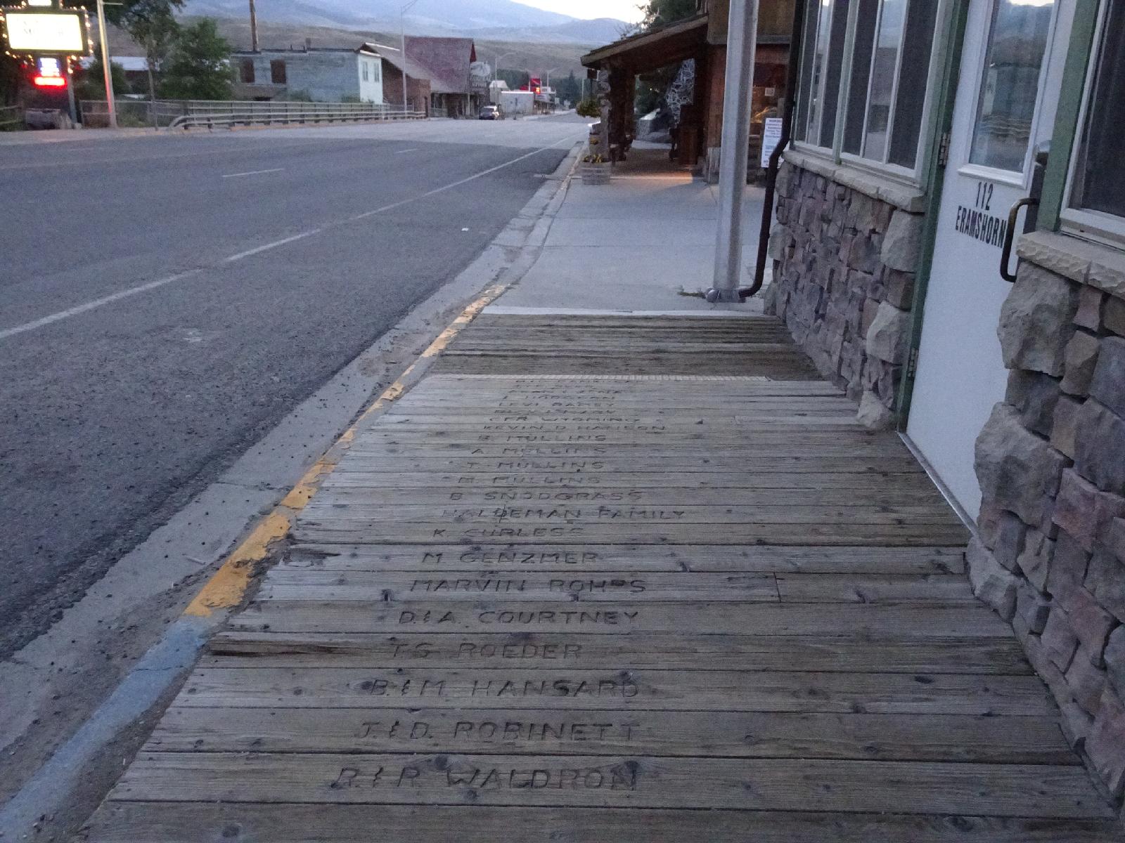 ![]() Names carved into the wooden sidewalk. UTC Time: 02:41, Friday 11 August 2017 Local Time: 20:41, Thursday 10 August 2017 Estimate of longitude: 109° 37' 55.63" W = -109.632120° Estimate of latitude: 43° 32' 1.72" N = 43.533810° Possible error on position estimate: 10 metres | |