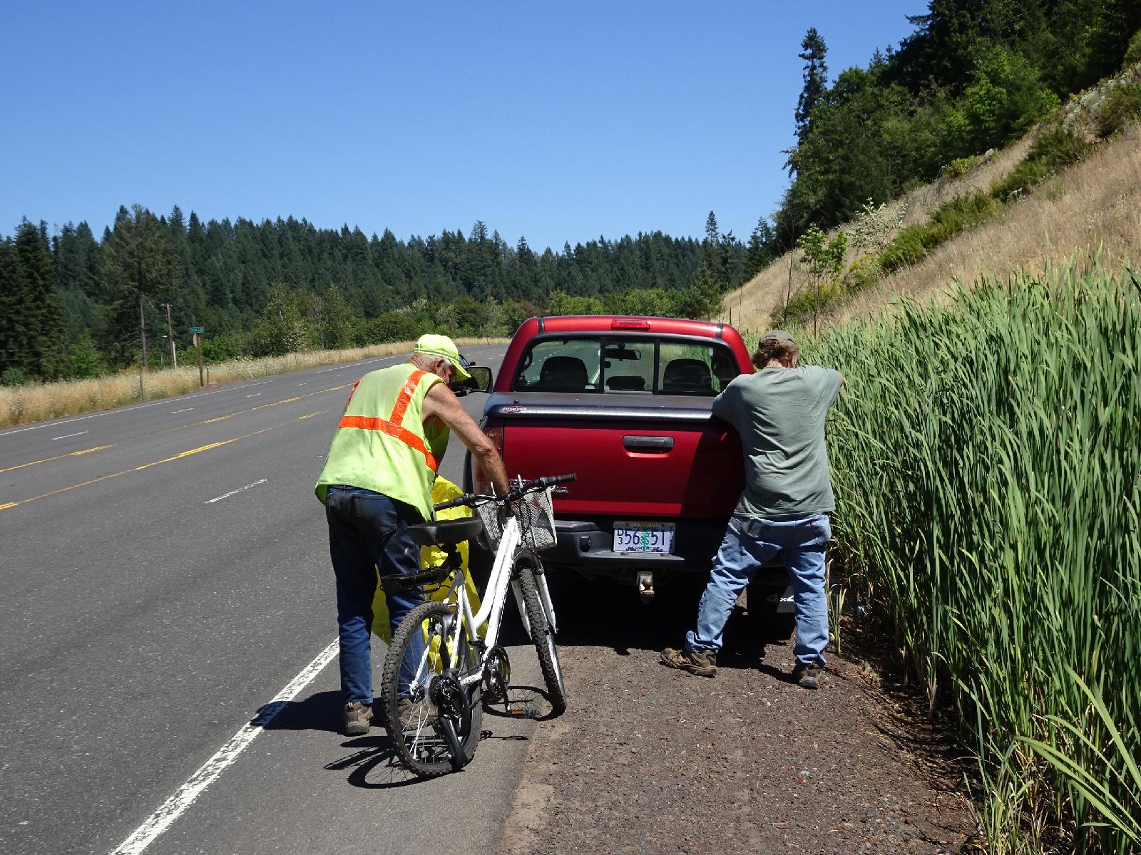 ![]() I saw this man ahead of me, obviously having problems with his bike. When I stopped, he spoke quite quietly so I could hardly hear him over the traffic noise but his rear inner tube was hanging out and was flat. I was about to start trying to fix it when the man in the pickup truck passed going in the opposite direction, then turned round and came over here to pick up the man and his bike. I heard the driver say "Haven't you already been out here once today?" so I don't really know what the story is. The only luggage that the cyclist had was that big yellow bag, which was full of empty plastic bottles. UTC Time: 21:26, Sunday 30 July 2017 Local Time: 14:26, Sunday 30 July 2017 Estimate of longitude: 122° 45' 24.59" W = -122.756830° Estimate of latitude: 44° 24' 16.74" N = 44.404650° Possible error on position estimate: 100 metres | |
