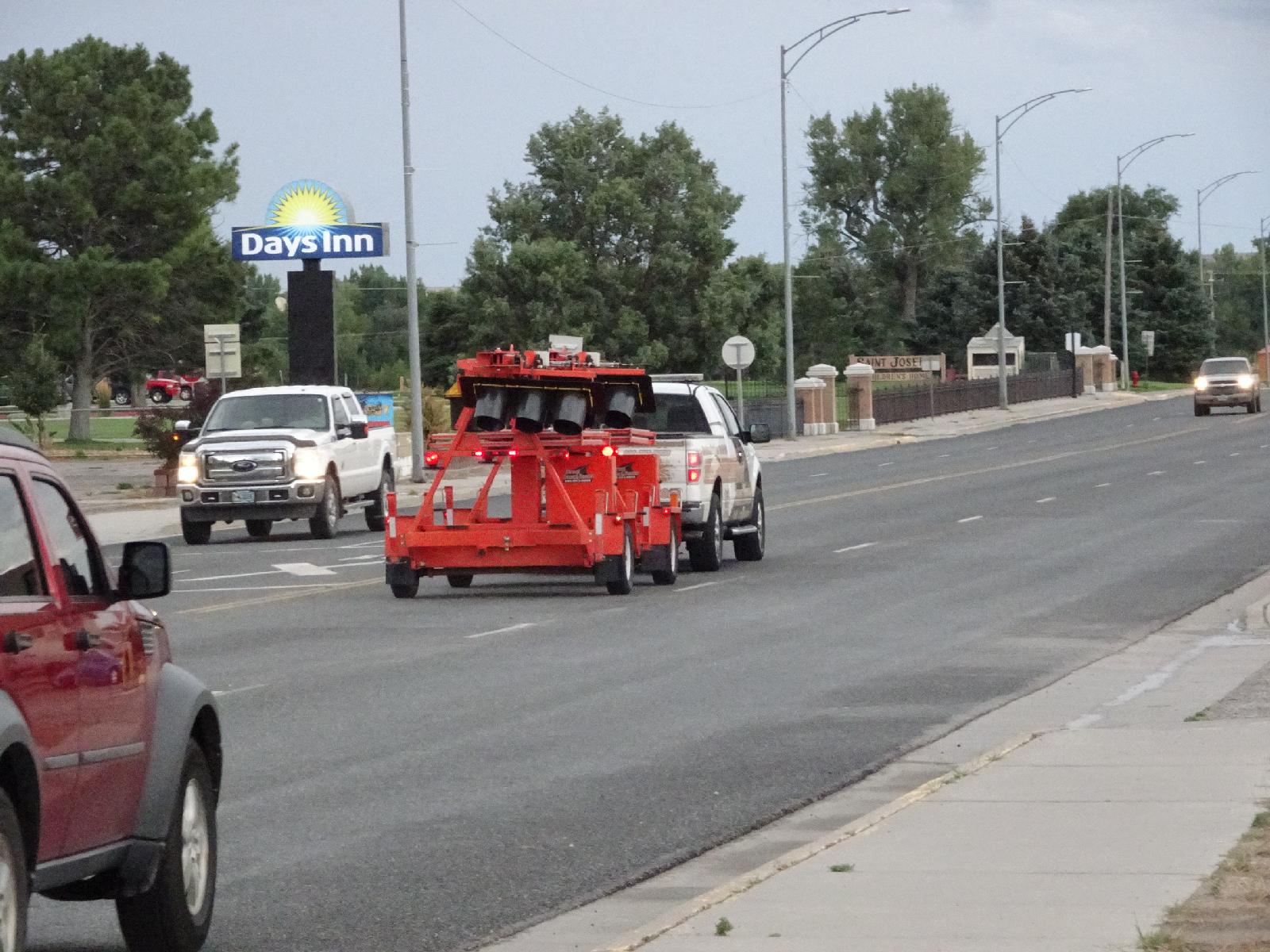 ![]() That vehicle has got some temporary traffic lights. I haven't seen any in operation. All the roadworks on this trip have had people holding signs to tell the traffic when to stop. UTC Time: 00:35, Wednesday 16 August 2017 Local Time: 18:35, Tuesday 15 August 2017 Estimate of longitude: 104° 11' 4.24" W = -104.184510° Estimate of latitude: 42° 3' 42.95" N = 42.061930° Possible error on position estimate: 20 metres | |