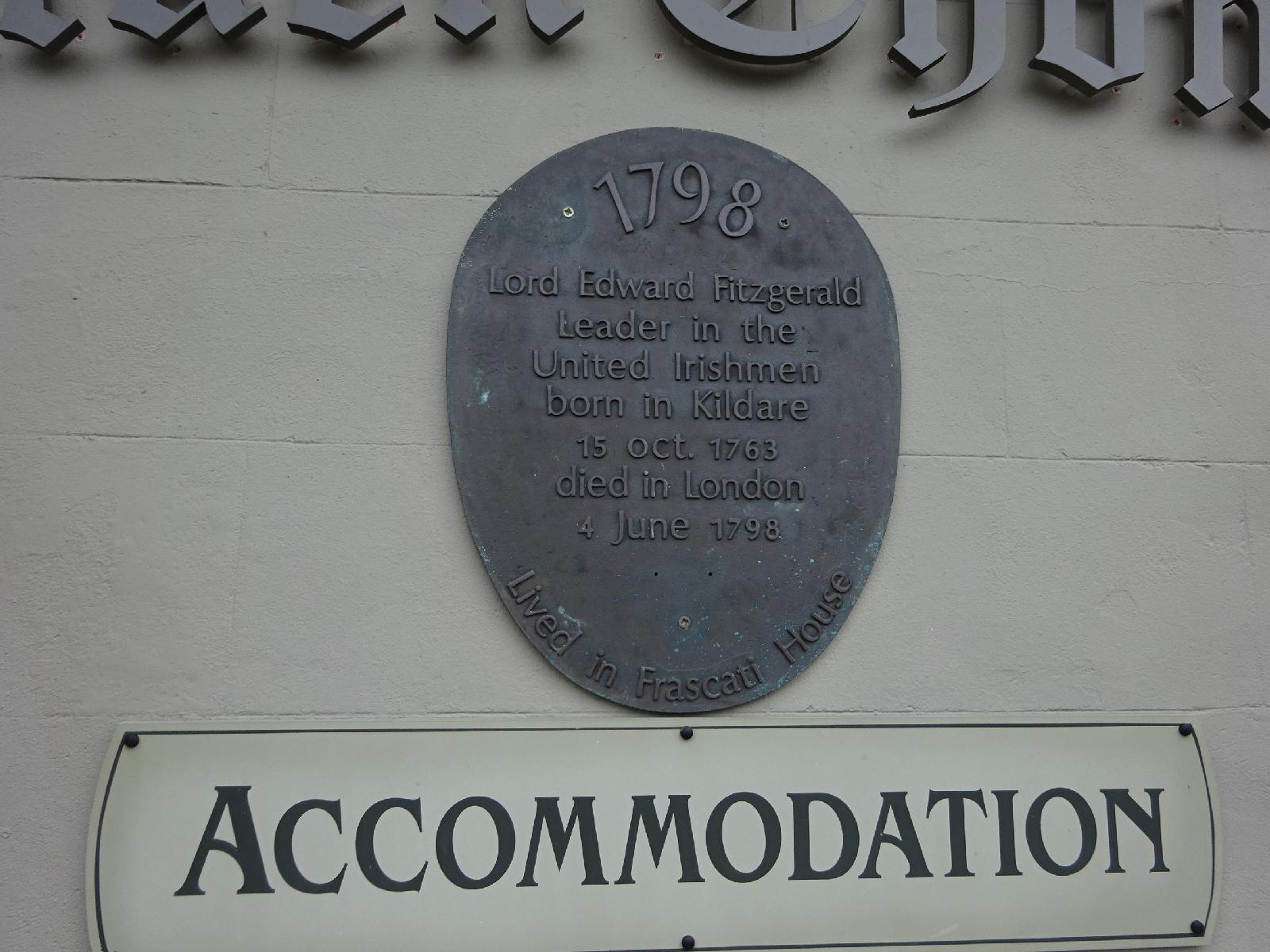 ![]() This plaque is on the outside of the building where I slept last night. The Pub is called Silken Thomas, which was the nickname of Thomas FitzGerald, the 10th Earl of Kildare, who lived from 1513 to 1537 and was involved in some way in fighting for greater power for Ireland. Lord Edward Fitzgerald was a completely different revolutionary who lived 250 years later. As it says, he was born in Kildare. I don't know why the plaque mentions Frascati (or Frescati) House though because that's in Dublin. It sort of looks as if that's where the plaque has been stolen from. UTC Time: 07:55, Saturday 15 September 2018 Local Time: 08:55, Saturday 15 September 2018 Estimate of longitude: 6° 54' 31.39" W = -6.908720° Estimate of latitude: 53° 9' 25.52" N = 53.157090° Possible error on position estimate: 100 metres | |