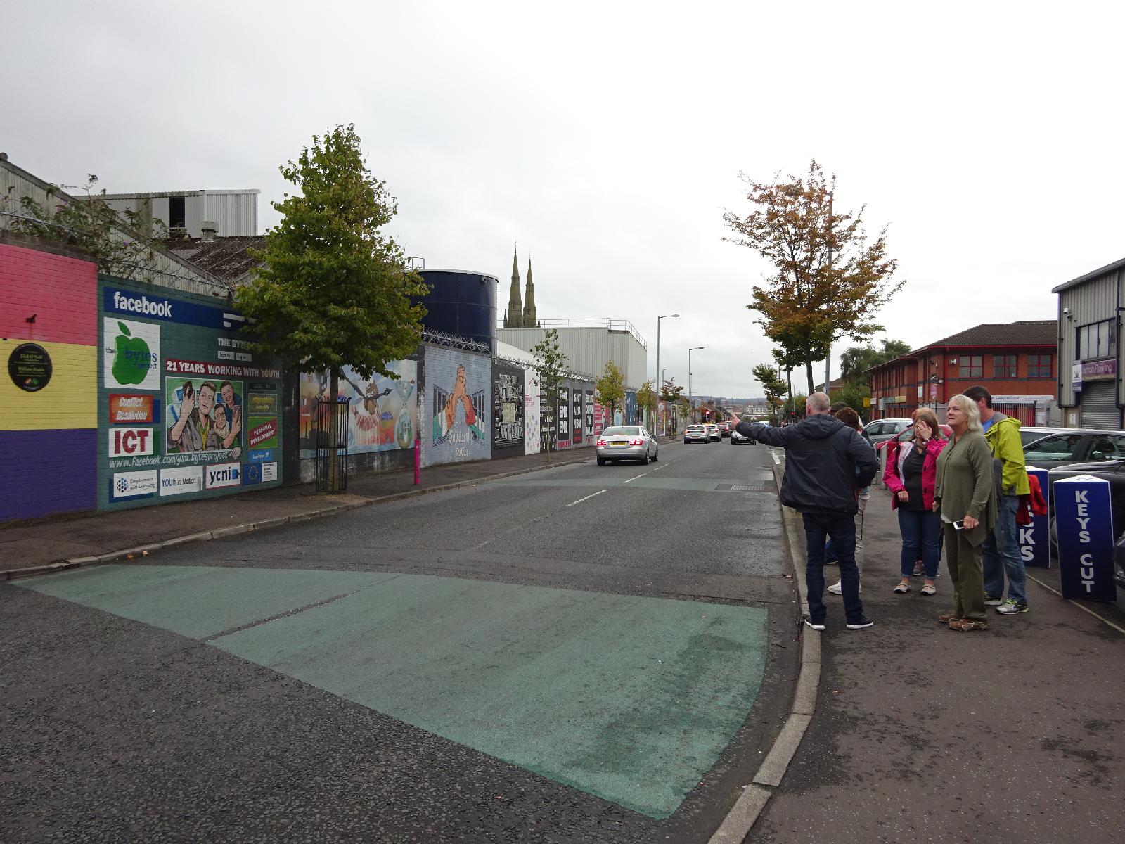 ![]() A tour guide pointing out where the road used to be barricaded. UTC Time: 13:38, Monday 17 September 2018 Local Time: 14:38, Monday 17 September 2018 Estimate of longitude: 5° 56' 50.10" W = -5.947250° Estimate of latitude: 54° 36' 2.48" N = 54.600690° Possible error on position estimate: 5 metres | |