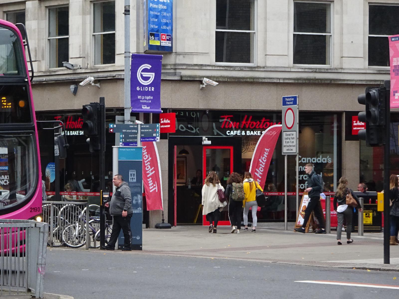 ![]() I don't think I've seen a Tim Hortons shop before. UTC Time: 15:54, Monday 17 September 2018 Local Time: 16:54, Monday 17 September 2018 Estimate of longitude: 5° 55' 51.82" W = -5.931060° Estimate of latitude: 54° 35' 49.74" N = 54.597150° Possible error on position estimate: 10 metres | |