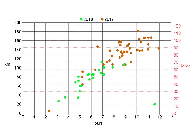 ![]() Back where I started. The bike has done well: its only incident has been one broken spoke. It's got the same tyres and chain as it had when I left here. That's not very remarkable really because at 1691 km, or 1051 miles, this trip has been less than a third of some other years'. It had felt like I was making slower progress every day than in previous years but the scatter plot below shows that I have actuually been riding at about the same speed as last year but just having shorter days. Also, in case you were wondering, I did actually go further by bike than by boat this year, although not by much. ![]() UTC Time: 16:18, Wednesday 19 September 2018 Local Time: 17:18, Wednesday 19 September 2018 Estimate of longitude: 2° 8' 60.00" W = -2.150000° Estimate of latitude: 53° 51' 36.00" N = 53.860000° Possible error on position estimate: 1000 metres | |