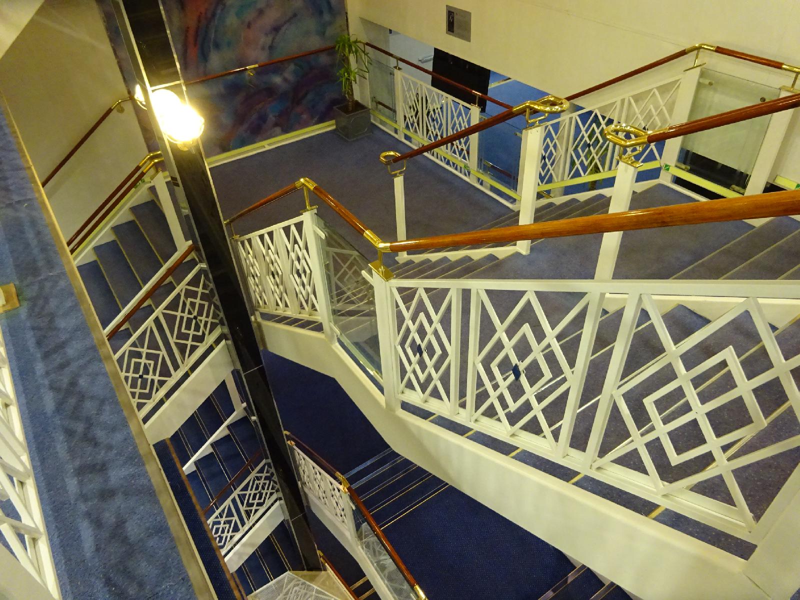 ![]() When I was locking my bike on the car deck, a member of staff came over specifically to show me the way to the stairs. I came up four flights of rather mundane stairs, emerged next to this grand staircase, and was then directed into a lift to go up the final one floor to where my cabin is. UTC Time: 05:27, Thursday 13 September 2018 Local Time: 06:27, Thursday 13 September 2018 Estimate of longitude: 6° 2' 24.90" W = -6.040250° Estimate of latitude: 51° 2' 22.85" N = 51.039680° Possible error on position estimate: 2000 metres | |