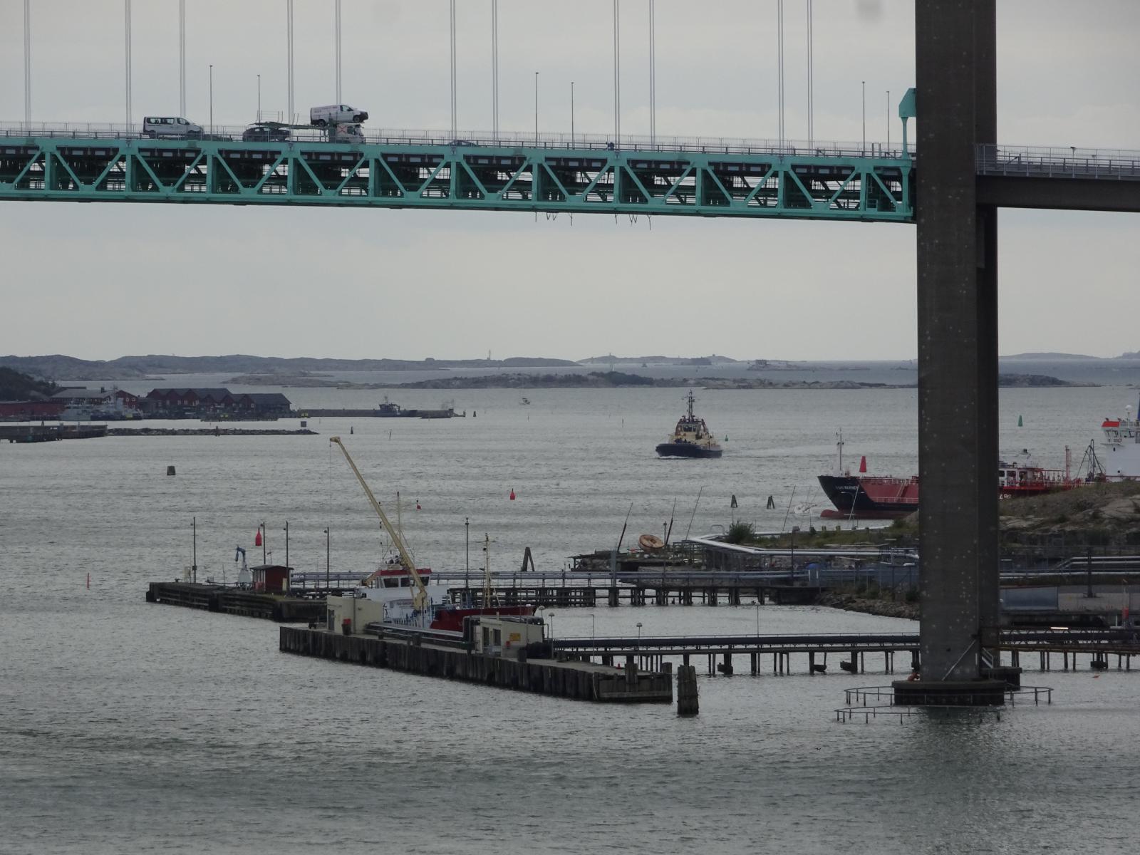 ![]() Under the bridge, we can see some of the rocks in the mouth of the River Göta. UTC Time: 13:55, Friday 30 August 2019 Local Time: 15:55, Friday 30 August 2019 Estimate of longitude: 11° 54' 45.43" E = 11.912620° Estimate of latitude: 57° 41' 42.32" N = 57.695090° Possible error on position estimate: 5 metres | |