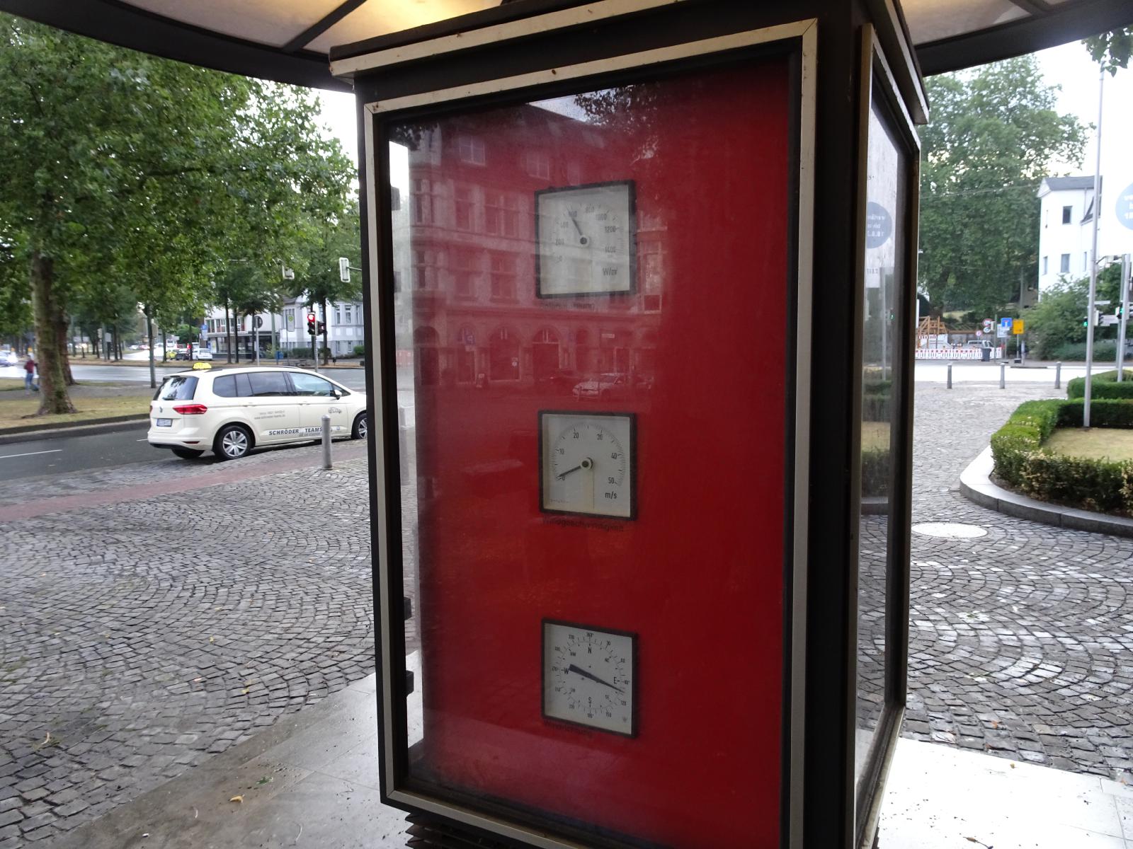 ![]() A little weather station. This side shows the intensity of the sunlight and the speed and direction of the wind. The wind measurements come from the roof of a nearby building. The other side shows temperature, humidity and pressure. According to the dials, it's currently 18 degrees and 27 percent humidity. Those don't sound high but it feels extremely muggy. UTC Time: 17:55, Thursday 15 August 2019 Local Time: 19:55, Thursday 15 August 2019 Estimate of longitude: 8° 31' 37.13" E = 8.526980° Estimate of latitude: 52° 1' 10.81" N = 52.019670° Possible error on position estimate: 5 metres | |