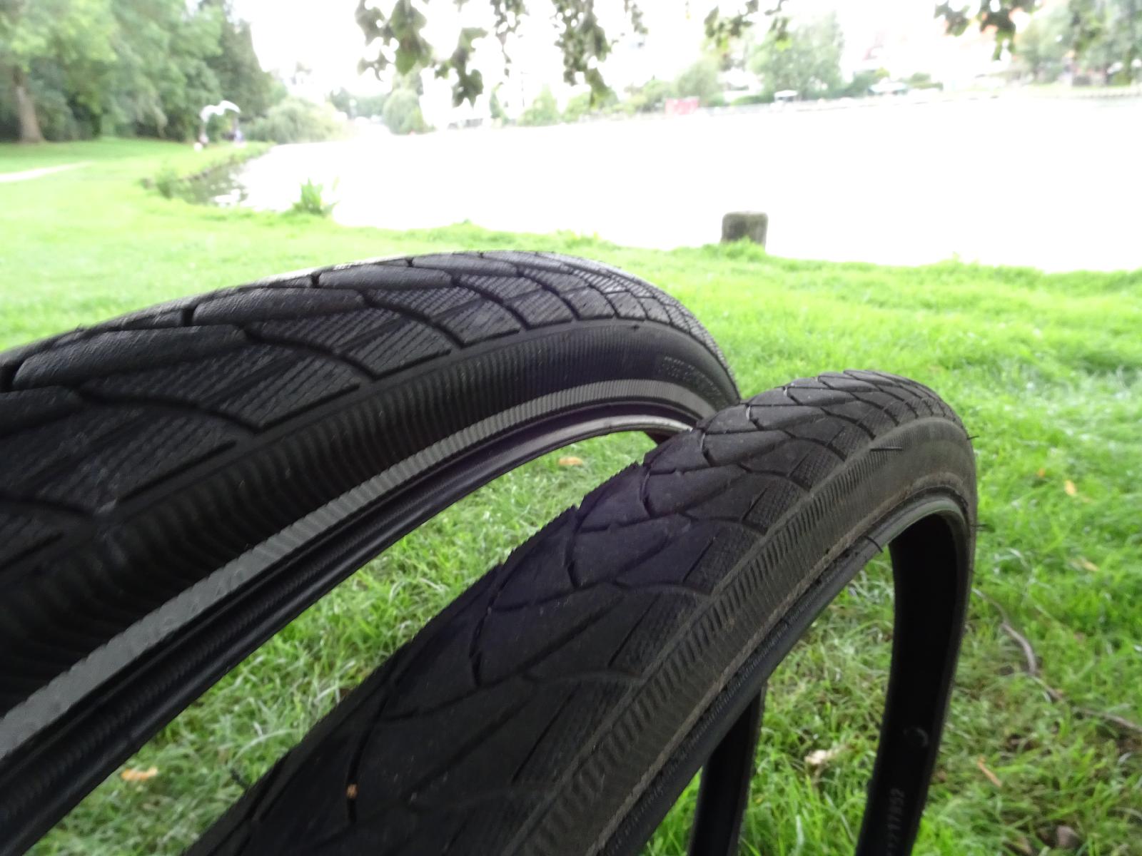 ![]() New and old tyres. They are exactly the same type. The old ones still have plenty of tread but in my experience, they most often tend to fail by bursting open around the rim and it's hard to tell when that will happen. The end of one of the spokes has gone rusty inside the wheel rim. I guess that must have been the one which was at the bottom one time when the bike was sitting out in the rain overnight. The online weather forecast shows no more rain for the next week, whereas the hand-drawn foreacast on a whiteboard in the hotel shows rain today. It would actually rain for a while just after dark this evening so perhaps the wheel will have two rusty spokes by tomorrow. UTC Time: 11:14, Tuesday 20 August 2019 Local Time: 13:14, Tuesday 20 August 2019 Estimate of longitude: 10° 41' 33.58" E = 10.692660° Estimate of latitude: 53° 51' 43.06" N = 53.861960° Possible error on position estimate: 10 metres | |