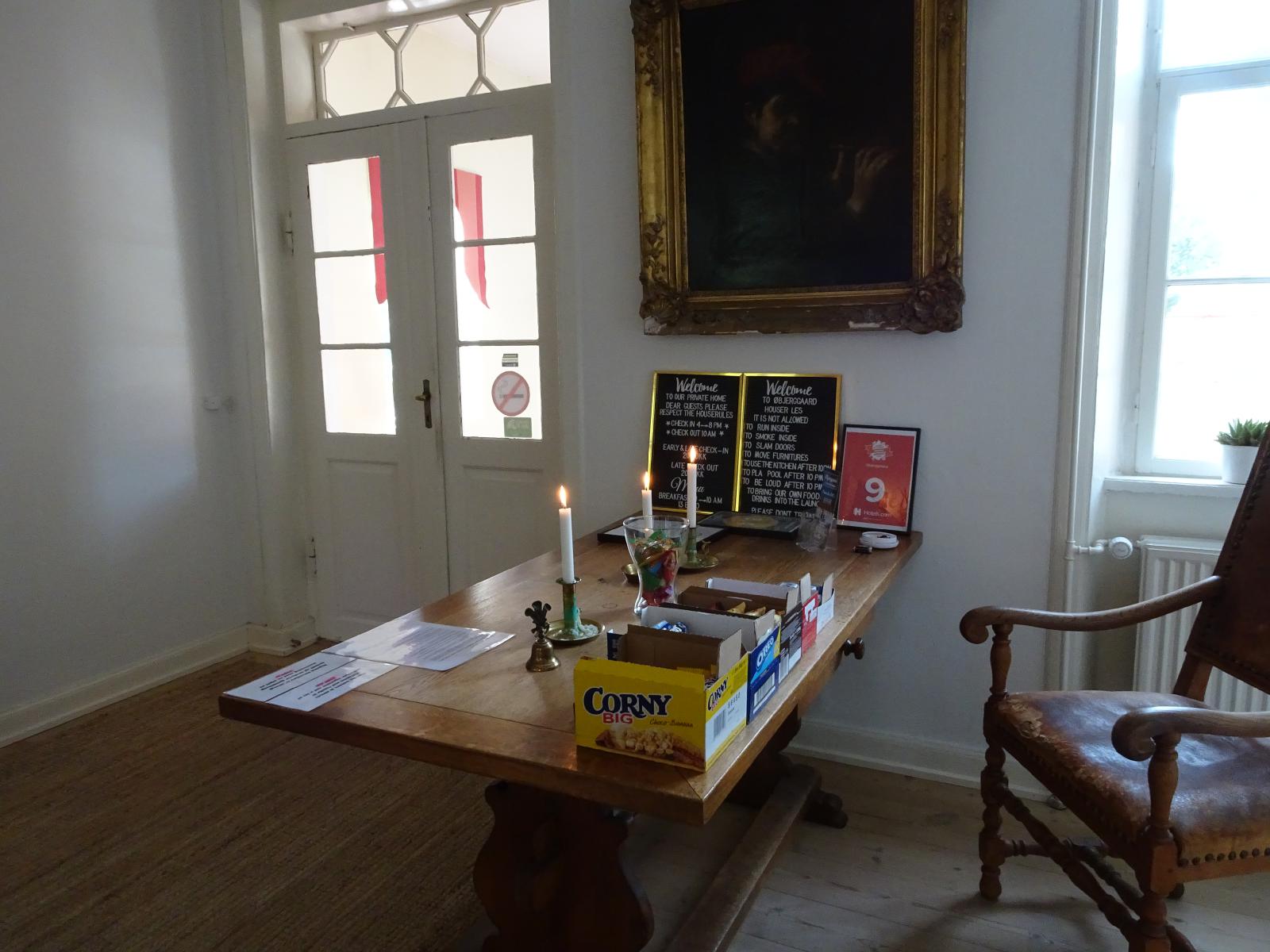 ![]() The other couple here are from Utrecht. They haven't ridden here from there like I have but they are in the middle of something like an 800 km cycling trip. We helped ourselves to a small breakfast buffet from the dining room and ate it out on the verandah. While we were there, the owner made a brief appearance to put new cushions on the chairs and to say that he was going out again. He likes to live dangerously. This time, he's not just gone out and left the place unlocked but he's also left three unattended candles burning on the desk, next to two signs which say "no smoking". UTC Time: 07:48, Friday 23 August 2019 Local Time: 09:48, Friday 23 August 2019 Estimate of longitude: 11° 49' 44.54" E = 11.829040° Estimate of latitude: 55° 6' 58.75" N = 55.116320° Possible error on position estimate: 50 metres | |