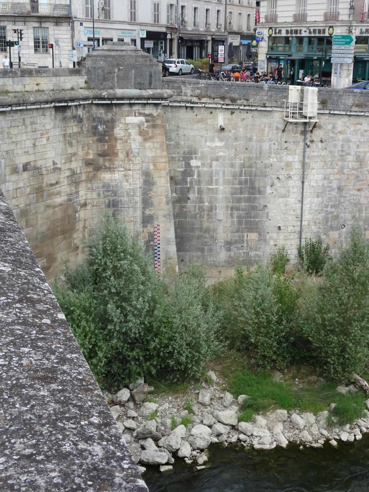 ![]() Above and to the left of the modern depth gauge is an older one painted on the stone. It marks the high water levels of some floods and appears to be marked in metres and feet. UTC Time: 13:06, Sunday 14 August 2022 Local Time: 15:06, Sunday 14 August 2022 Estimate of longitude: 1° 54' 15.73" E = 1.904370° Estimate of latitude: 47° 53' 51.61" N = 47.897670° Possible error on position estimate: 5 metres | |
