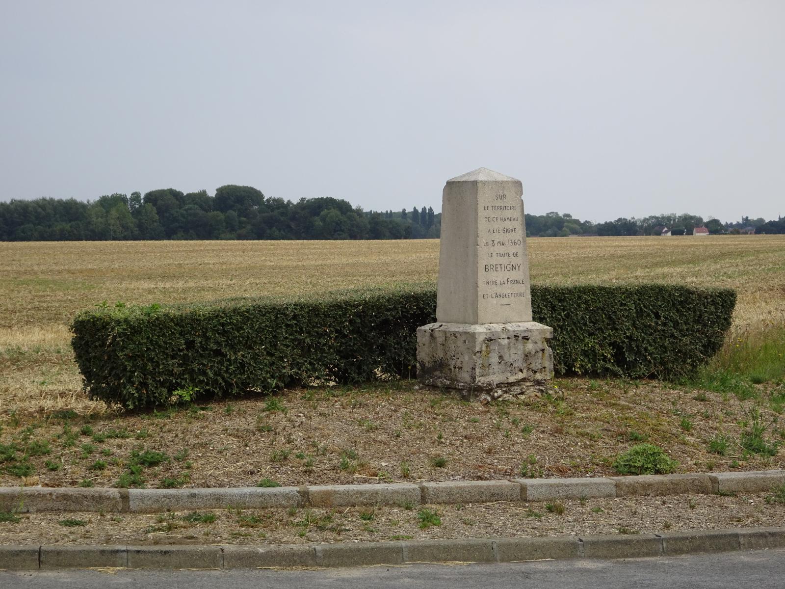 ![]() This is a monument to the treaty of Bretigny, which was signed here between England and France in 1360. It can't have done much good though because that was 23 years into what we now know as the Hundred Years' War. UTC Time: 13:18, Tuesday 16 August 2022 Local Time: 15:18, Tuesday 16 August 2022 Estimate of longitude: 1° 34' 13.87" E = 1.570520° Estimate of latitude: 48° 25' 4.98" N = 48.418050° Possible error on position estimate: 5 metres | |