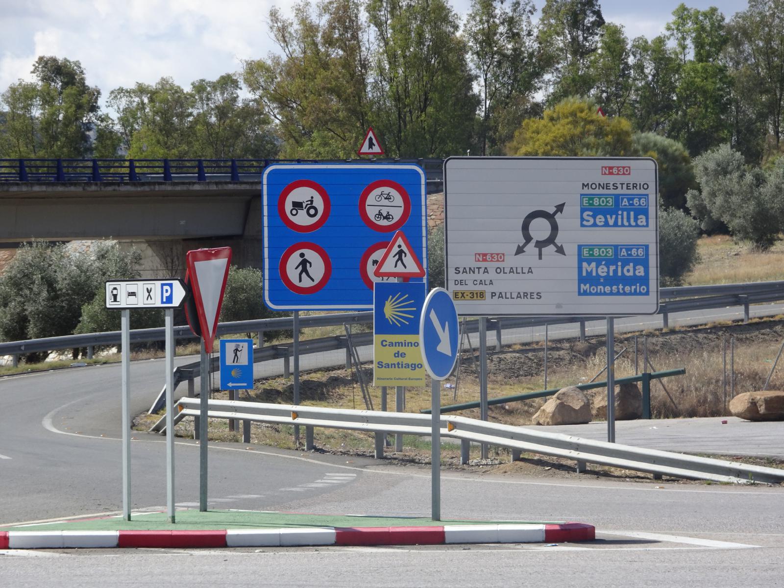 ![]() This is the second time today that I've seen signs saying that the Camino de Santiago is crossing my route. This must be quite a small branch of the Camino. The main branch doesn't come anything like this far South. UTC Time: 15:31, Wednesday 24 May 2023 Local Time: 17:31, Wednesday 24 May 2023 Estimate of longitude: 6° 13' 12.79" W = -6.220220° Estimate of latitude: 38° 1' 42.89" N = 38.028580° Possible error on position estimate: 5 metres | |
