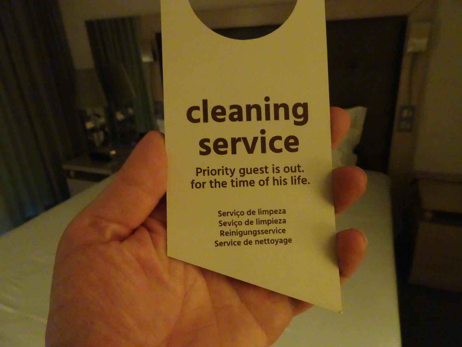 ![]() This is the sign to hang on the door if you want the room to be cleaned. Firstly, I doubt whether anybody has ever had the time of their life here. Secondly, I think I remember seeing something about being a priority guest when I booked the room. I don't know what it means though. The website where I booked it does say that I'm entitled to "1 free beverage per person for 2 once per stay". UTC Time: 18:35, Saturday 03 June 2023 Local Time: 19:35, Saturday 03 June 2023 Estimate of longitude: 8° 50' 52.48" W = -8.847910° Estimate of latitude: 41° 51' 55.51" N = 41.865420° Possible error on position estimate: 10 metres | |