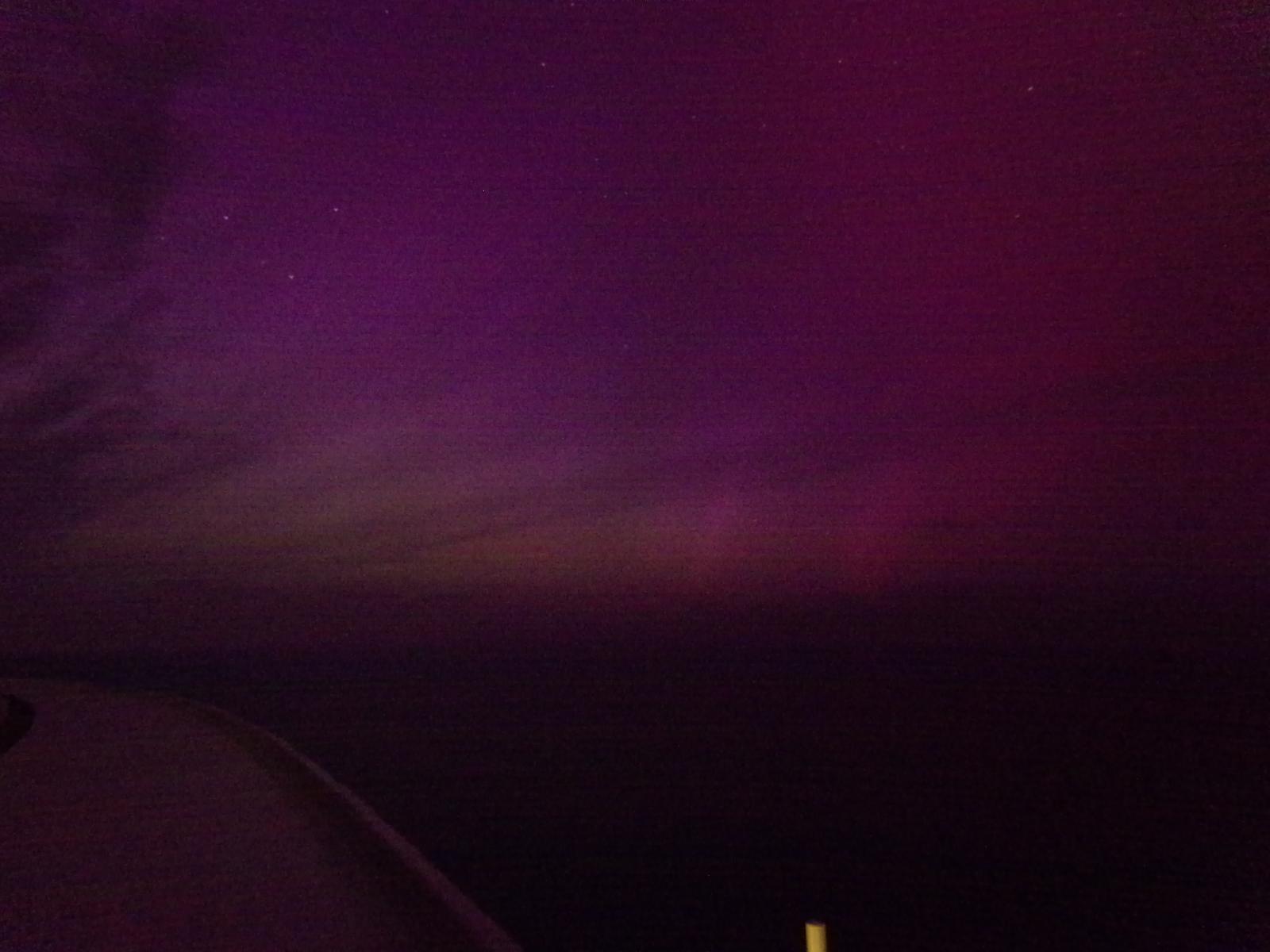 ![]() For the last few hours I have been seeing amazing photographs of the aurora taken from all over Britain, even central London. I thought that here at sea with no light polution we would have an even better view but it's actually very feint. Another man who is here on the bridge taking photographs showed me a map on his phone which shows that although the whole of Britain and Ireland are within a region of high geomagnetic activity, the amount of activity here is much lower. This is the best picture that I got, taken in the brief period between when I worked out how to change my new camera's exposure settings and when we went back under clouds. UTC Time: 01:06, Saturday 11 May 2024 Local Time: 01:06, Saturday 11 May 2024 Estimate of longitude: 13° 24′ 45.11″ W = -13.412530° Estimate of latitude: 50° 21′ 15.05″ N = 50.354180° Possible error on position estimate: 500 metres | |