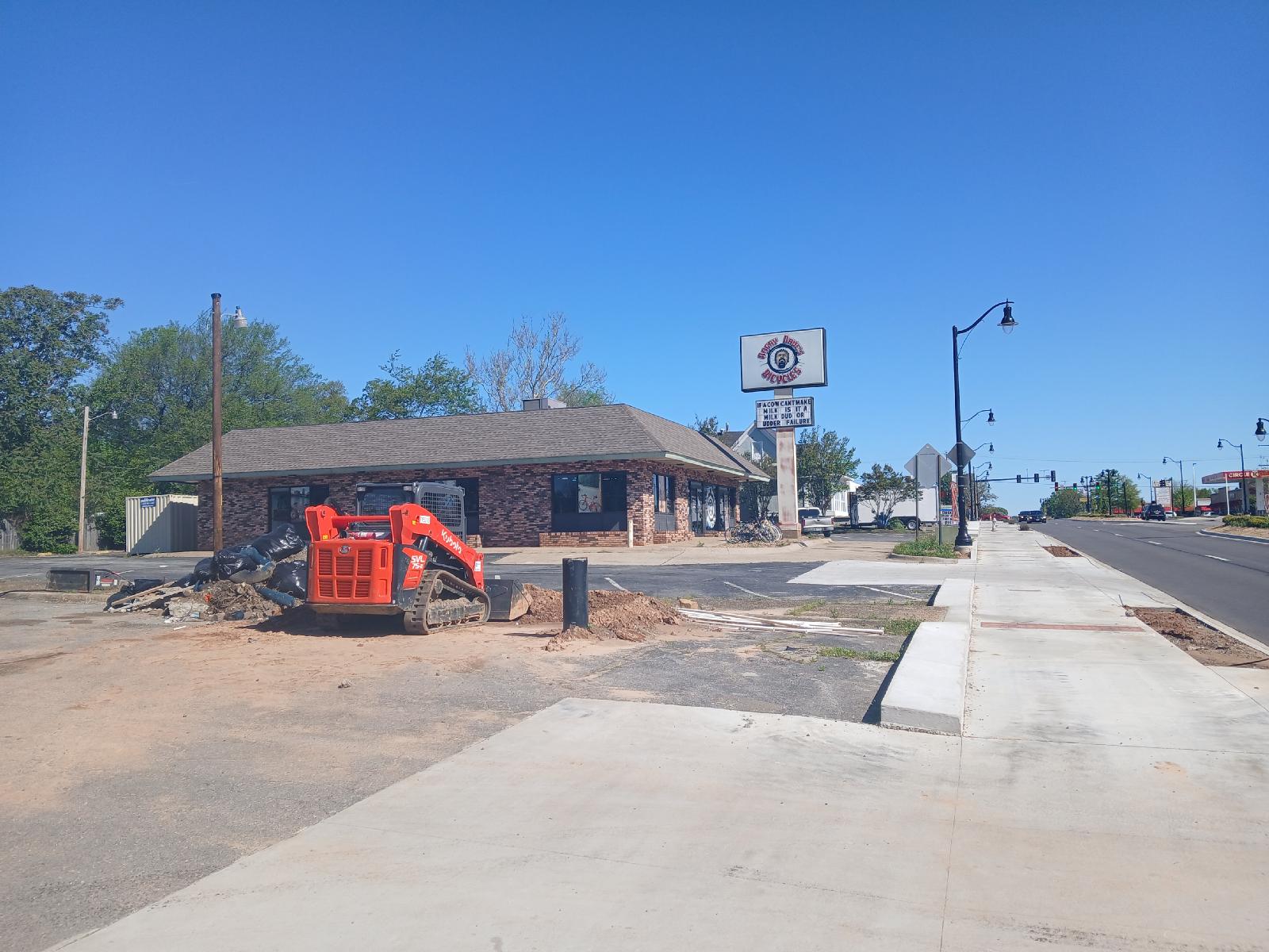 ![]() Angry Dave's Bicycles, at the top of the hill just where I expected it to be. It's open and was able to do everything that I wanted. Angry Dave himself wasn't there at first but the man who served me was extremely helpful and did a thorough job. It was everything I could have asked for. He replaced both my tyres and the inner tube which had the slow puncture, sold me two more spare tubes, and found that the bottom bracket hadn't been installed correctly. That explained why it had been clicking and why it has been so hard to get the chain onto the big cog at the front. Using just the small cog has been fine until now but I think that from here on, I will be spending a lot of time on pretty flat ground with a tailwind, so being able to cruise along in the high gears will be useful. Normally a shop which sells a bike provides this service for free after a month or so but that isn't really possible if you buy a new bike and immediately leave the state on it. Since the ride back from the shop to the hotel was all downhill, I didn't get chance to test what it's like to pedal the bike now but at least I know that the brakes work. The aches in my legs still seem to be gradually improving. Walking up the hill wasn't very painful at all. However now my eyes are hurting. The very bright sunshine and these white pavements aren't helping that. I looked to see if the shop sold any kind of headband to keep sweat our of my eyes but I couldn't see one. I did realise though that my hair has become long enough to reach my eyeballs and wondered whether that could be causing the irritation. On getting back to the hotel I crudely trimmed my fringe to see if helped. That at least justifies bringing a big pair of scissors with me. UTC Time: 15:11, Friday 12 April 2024 Local Time: 10:11, Friday 12 April 2024 Estimate of longitude: 92° 15′ 38.41″ W = -92.260670° Estimate of latitude: 34° 47′ 3.80″ N = 34.784390° Possible error on position estimate: 5 metres | |