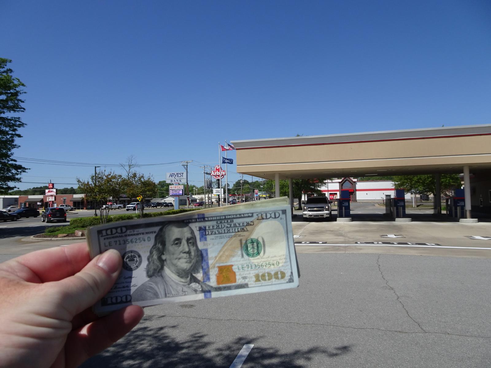 ![]() I had difficulty using my bank card three times yesterday so I thought I had better get some more cash from this drive-through bank in case I had problems in future. It gave me a $100 bill. It's arguably the largest-value note I've ever held. In 2003 a cash machine in Norway gave me a 1000 krone note. At the time, that was worth about $137 but because of changing exchange rates, $100 is now 1090 krone. UTC Time: 16:08, Saturday 13 April 2024 Local Time: 11:08, Saturday 13 April 2024 Estimate of longitude: 92° 11′ 17.02″ W = -92.188060° Estimate of latitude: 34° 49′ 57.00″ N = 34.832500° Possible error on position estimate: 5 metres | |