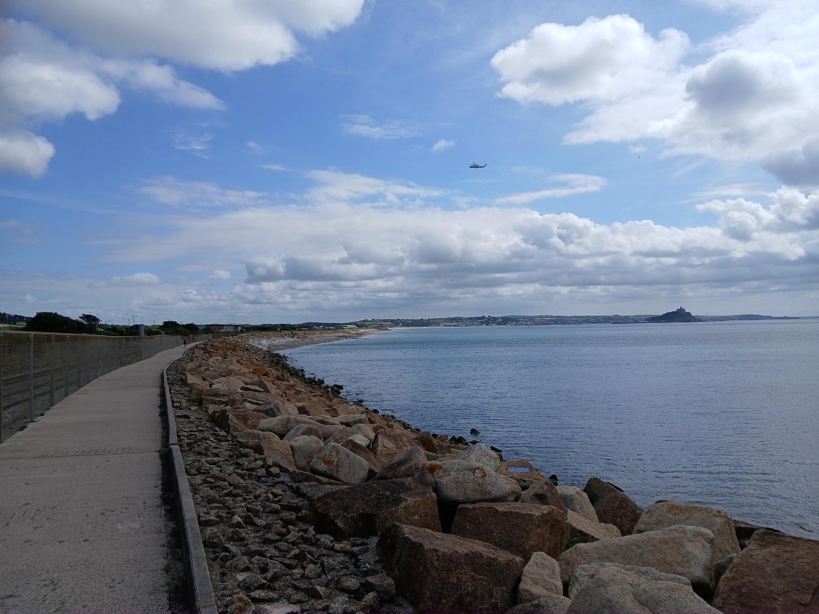 ![]() Here the South West Coast Path is also open to cyclists and runs between the railway line and the coast. In the sky is one of the helicopters which operate quite frequently between here and the Isles of Scilly. UTC Time: 10:38, Friday 01 August 2025 Local Time: 11:38, Friday 01 August 2025 Estimate of longitude: 5° 31′ 38.03″ W = -5.527230° Estimate of latitude: 50° 7′ 31.40″ N = 50.125390° Possible error on position estimate: 5 metres | |